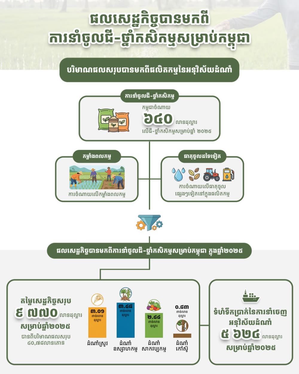 អ្នកនាំពាក្យឆ្លើយតបព័ត៌មានថា កម្ពុជាបាននាំចូលជី និងថ្នាំកសិកម្មក្នុងទំហំទឹកប្រាក់ ៦៣៦លានដុល្លារ ក្នុងឆ្នាំ២០២៥