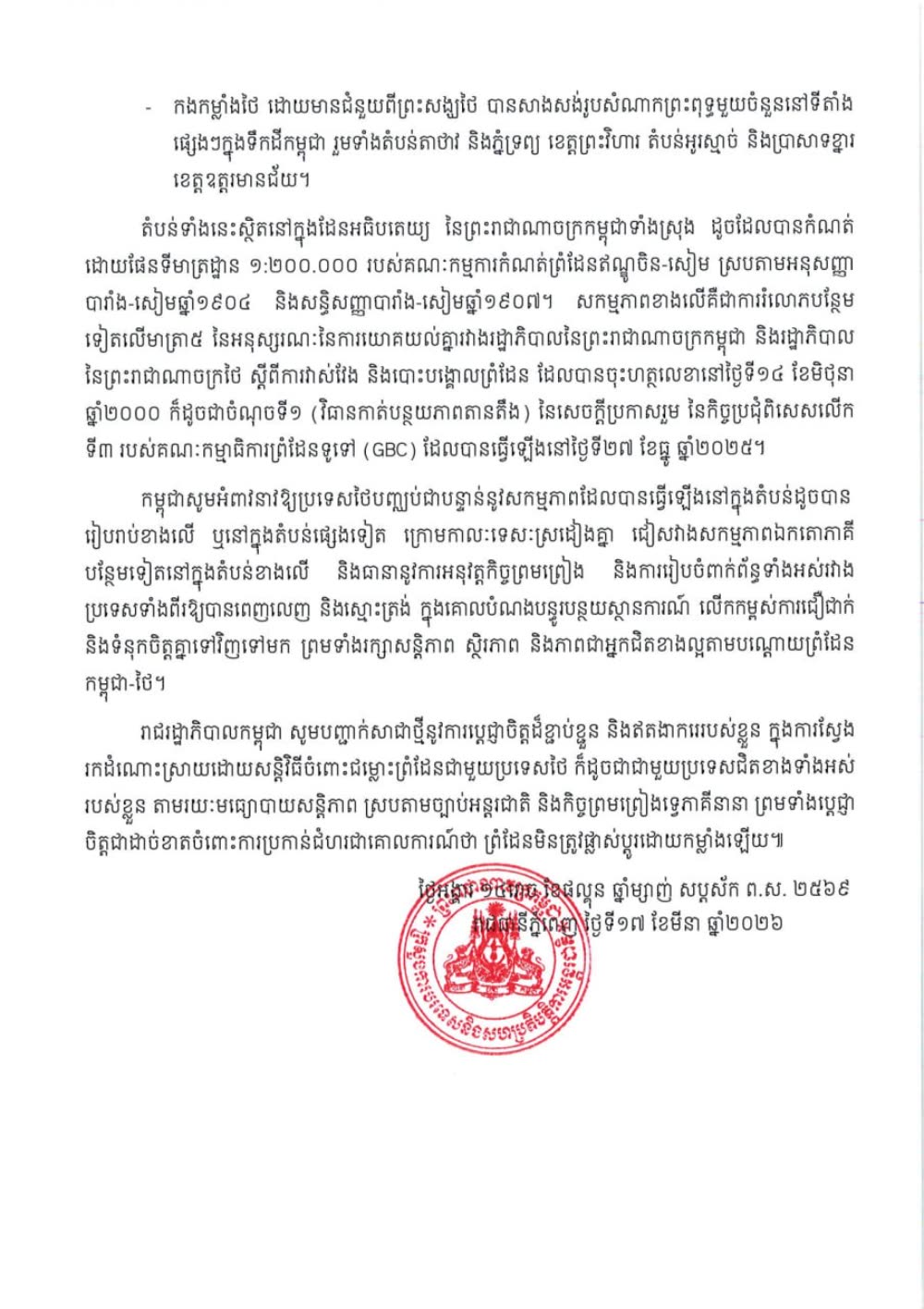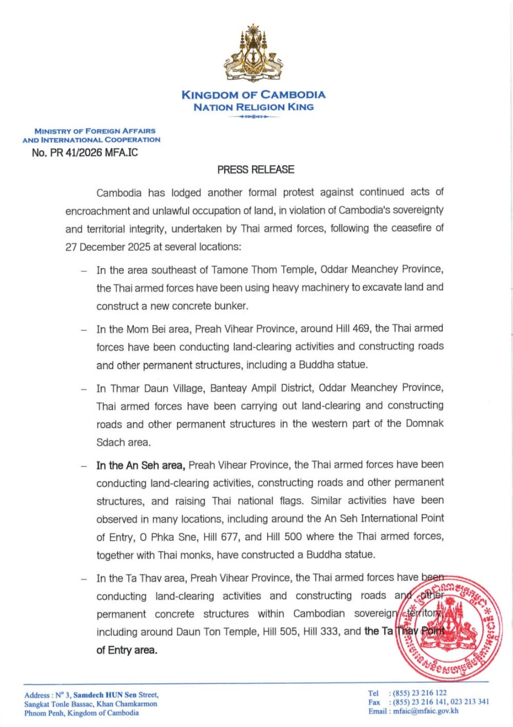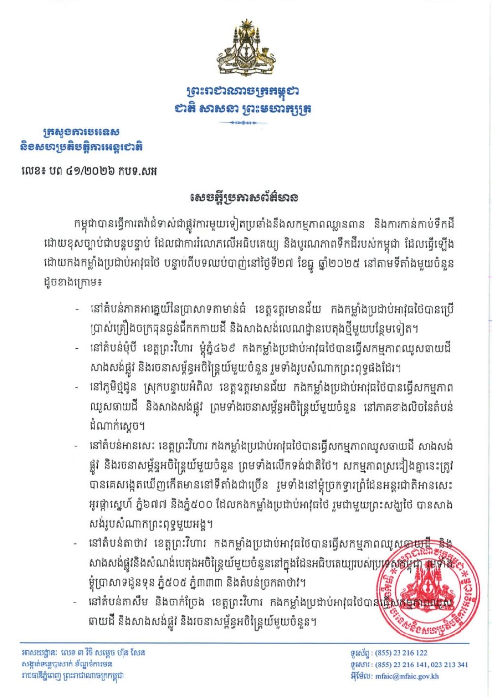 ក្រសួងការបរទេស៖ កម្ពុជាបានធ្វើការតវ៉ាជំទាស់ជាផ្លូវការមួយទៀតប្រឆាំងនឹងសកម្មភាពឈ្លានពាន និងការកាន់កាប់ទឹកដី ដោយខុសច្បាប់ជាបន្តបន្ទាប់ ដែលជាការរំលោភលើអធិបតេយ្យ និងបូរណភាពទឹកដីរបស់កម្ពុជា ដែលធ្វើឡើង ដោយកងកម្លាំងប្រដាប់អាវុធថៃ បន្ទាប់ពីបទឈប់បាញ់នៅថ្ងៃទី២៧ ខែធ្នូ ឆ្នាំ២០២៥។