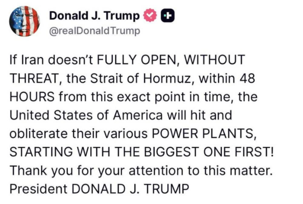 នៅក្នុងការបង្ហោះមួយនៅលើគណនី Truth Social របស់លោក លោក Trump បាននិយាយថា ប្រសិនបើអ៊ីរ៉ង់មិនបើកផ្លូវទឹកនេះឲ្យបានពេញលេញ និងសុវត្ថិភាពក្នុងរយៈពេលនោះទេ សហរដ្ឋអាមេរិកនឹងបំផ្លាញទីតាំងផលិតថាមពលសំខាន់ៗរបស់អ៊ីរ៉ង់ ដោយចាប់ផ្តើមពីកន្លែងធំបំផុត។