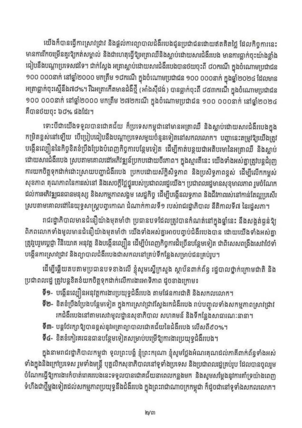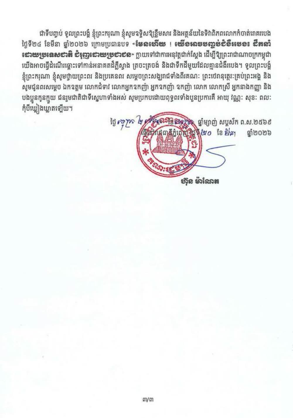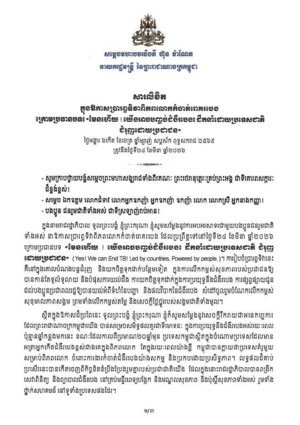នេះបើយោងតាមសារលិខិតសម្តេចធិបតី ហ៊ុន ម៉ាណែត នាយករដ្ឋមន្ត្រីនៃកម្ពុជា ក្នុងឱកាសប្រារព្ធទិវាពិភពលោកកំចាត់រោគរបេង ក្រោមប្រធានបទ៖ «មែនហើយ ! យើងអាចបញ្ចប់ជំងឺរបេង៖ ដឹកនាំដោយប្រទេសជាតិ ជំរុញដោយប្រជាជន» នាថ្ងៃទី២០ ខែមីនា ឆ្នាំ២០២៦នេះ។