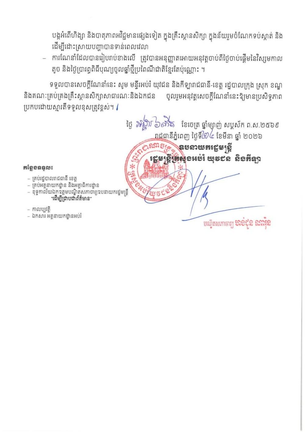 ក្រសួងអប់រំ យុវជន និងកីឡា បញ្ជាក់ថា ការណែនាំដែលបានរៀបរាប់នេះ ត្រូវបានអនុញ្ញាតអោយអនុវត្តចាប់ពីថ្ងៃចាប់ផ្តើមនៃវិស្សមកាល តូច និងថ្ងៃប្រារព្ធពិធីបុណ្យចូលឆ្នាំថ្មីប្រពៃណីជាតិខ្មែរតែប៉ុណ្ណោះ៕