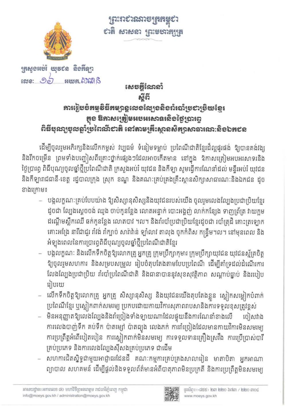 ដើម្បីចូលរួមអភិរក្សនិងលើកកម្ពស់ វប្បធម៌ ទំនៀមទម្លាប់ ប្រពៃណីជាតិខ្មែរដ៏ល្អផូរផង់ ឱ្យបានគង់វង្ស និងរីកចម្រើន ព្រមទាំងបញ្ចៀសពីគ្រោះថ្នាក់ផ្សេងៗដែលអាចកើតមាន នៅក្នុងឱកាសត្រៀមអបអរសាទរនិង ថ្ងៃប្រារព្ធ ពិធីបុណ្យចូលឆ្នាំថ្មីប្រពៃណីជាតិ ក្រសួងអប់រំ យុវជន និងកីឡា ណែនាំដល់គ្រឹះស្ថានសិក្សាទាំងសាធារណៈ និងឯកជន ឱ្យមានការលេងល្បែងប្រជាប្រិយ និងរបាំខ្មែរ។