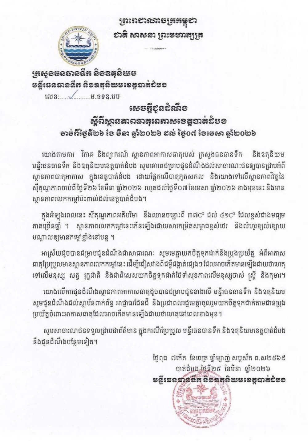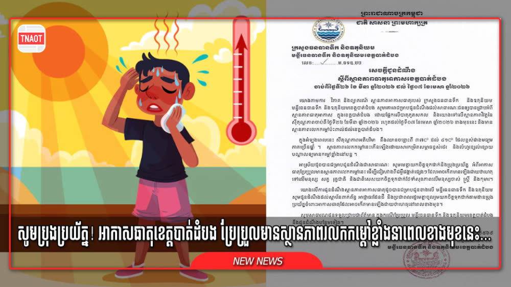 មន្ទីរធនធានទឹក និងឧតុនិយមខេត្តបាត់ដំបង បានចេញសេចក្តីជូនដំណឹងស្តីពីស្ថានភាពធាតុអាកាសខេត្តបាត់ដំបង ដោយផ្អែកលើបាតុភូតសកល និងយោងទៅលើស្ថានភាពវិវត្តនៃ ស៊ីតុណ្ហភាពចាប់ពី ថ្ងៃទី២៦ ខែមីនា ឆ្នាំ២០២៦ រហូតដល់ថ្ងៃទី០៧ ខែមេសា ឆ្នាំ២០២៦ ខាងមុខនេះ និងមាន ស្ថានភាពរលកកម្ដៅប៉ះពាល់ដល់ខេត្តបាត់ដំបង។