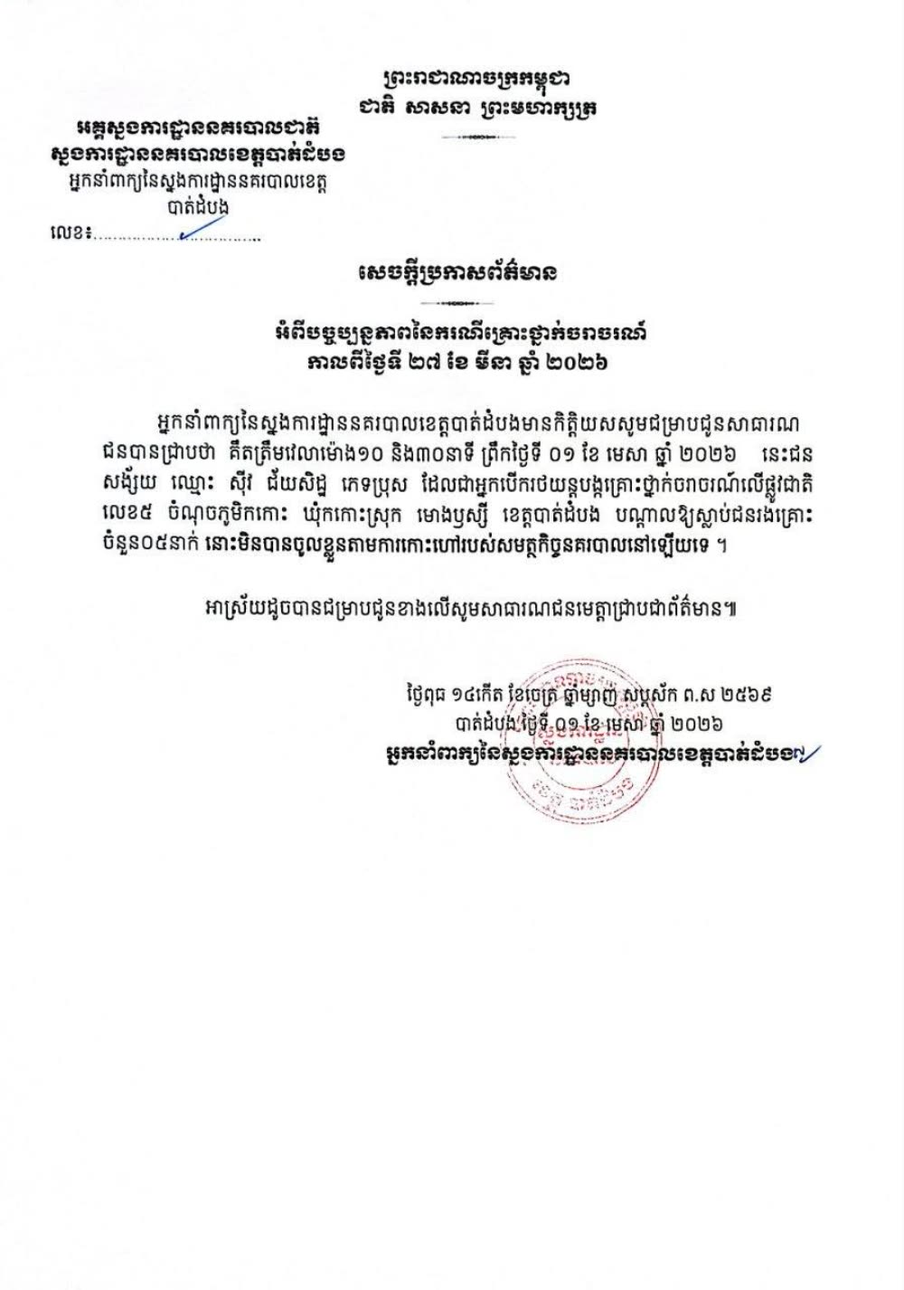 អ្នកនាំពាក្យនៃស្នងការដ្ឋាននគរបាលខេត្តបាត់ដំបង៖ គិតត្រឹមវេលាម៉ោង១០ និង៣០នាទី ព្រឹកថ្ងៃទី ០១ ខែ មេសា ឆ្នាំ ២០២៦ នេះជន សង្ស័យ ឈ្មោះ ស៊ីវ ជ័យសិដ្ឋ ភេទប្រុស ដែលជាអ្នកបើករថយន្តបង្កគ្រោះថ្នាក់ចរាចរណ៍លើផ្លូវជាតិ លេខ៥ ចំណុចភូមិកកោះ ឃុំកកោះស្រុក មោងឫស្សី ខេត្តបាត់ដំបង បណ្តាលឱ្យស្លាប់ជនរងគ្រោះ ចំនួន០៥នាក់ នោះមិនបានចូលខ្លួនតាមការកោះហៅរបស់សមត្ថកិច្ចនគរបាលនៅឡើយទេ ។