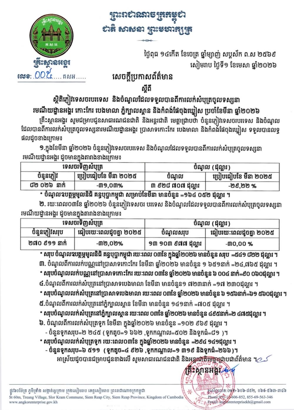 កម្ពុជារកចំណូលបាន ១៣ ១០៣ ៩៧៧ ដុល្លារអាម៉េរិក ពីការលក់សំបុត្រចូលទស្សនារមណីយដ្ឋានអង្គរ ក្នុងរយៈពេល ៣ខែ ដើមឆ្នាំ២០២៦៕