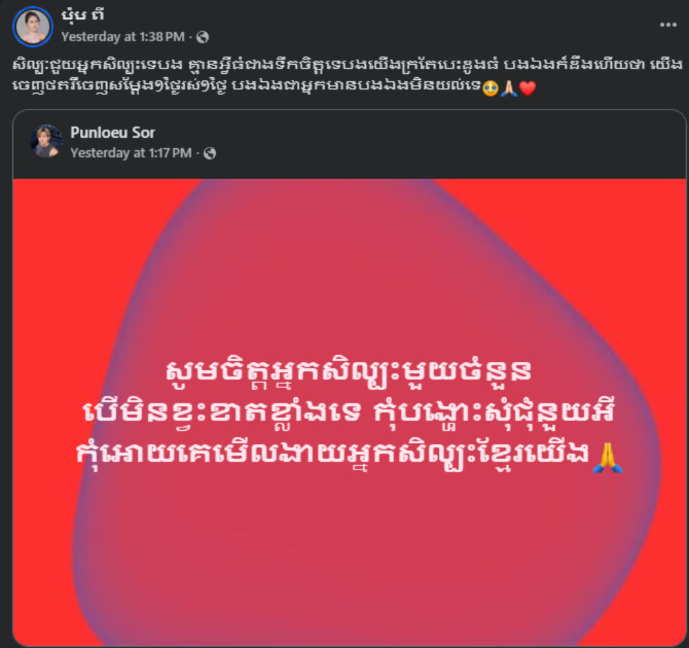 តារាសម្ដែងដ៏ល្បីល្បាញក្នុងទសវត្សរ៍ឆ្នាំ២០០០ លោក សោ ពន្លឺ ដែលត្រូវបានគេស្គាល់ថាជា F4 កម្ពុជា ដោយបច្ចុប្បន្នលោកកំពុងរស់នៅសាងគ្រួសារយ៉ាងមានសុភមង្គលនៅប្រទេសអូស្ត្រាលី បានបង្ហោះសំណេរមួយស្នើសុំដល់អ្នកសិល្បៈមួយចំនួន បេីមិនខ្វះខាតខ្លាំងទេ កុំបង្ហោះសុំជុំនួយអី កុំអោយគេមេីលងាយអ្នកសិល្បះខ្មែរ។