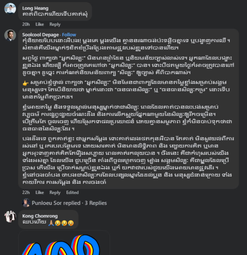 ក្រោយពីបានឃើញនូវសំណេរទាំងនេះហើយ បណ្ដាអ្នកលេងបណ្ដាញសង្គមរួមទាំងអ្នកសិល្បៈមួយចំនួនបានចូលទៅស៊ែរចែករំលែកបន្ត និងបញ្ចេញមតិវែកញែកជាហូរហែរ ដោយក្នុងនោះមានទាំងមតិគាំទ្រ ព្រមទាំងមតិប្រតិកម្មផ្សេងៗទៀតផងដែរ៕