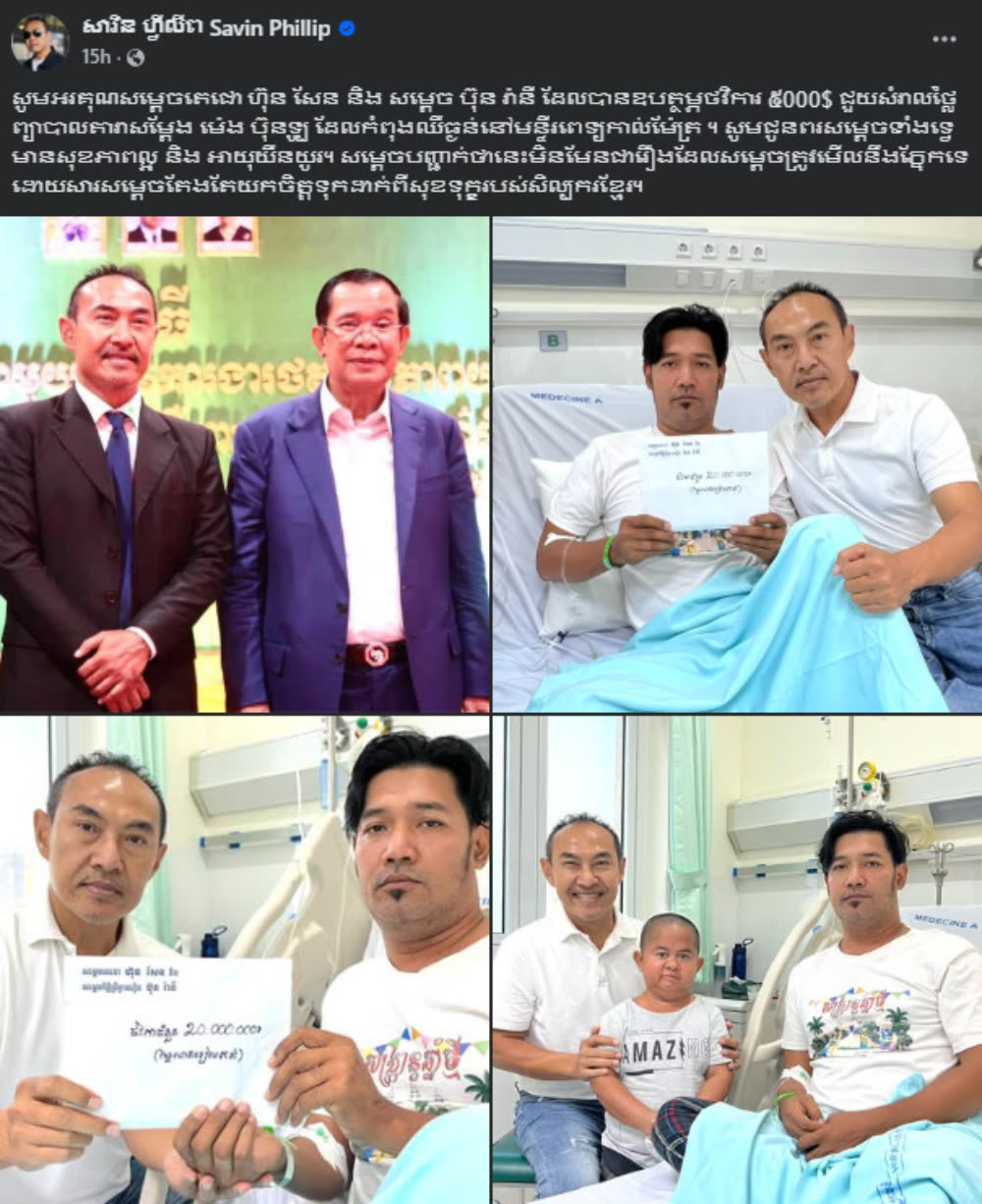យ៉ាងណាមិញ យោងតាមសំណេរលោក សាវីន ហ្វិលិព បានថ្លែងអំណរគុណយ៉ាងដូច្នេះថា៖ «សូមអរគុណសម្ដេចតេជោ ហ៊ុន សែន និង សម្ដេច ប៊ុន រ៉ានី ដែលបានឧបត្ថម្ភថវិការ ៥០០០$ ជួយសំរាលថ្លៃព្យាបាលតារាសម្ដែង ម៉េង ប៊ុនទ្បូ ដែលកំពុងឈឺធ្ងន់នៅមន្ទីរពេទ្យកាល់ម៉ែត្រ ។ សូមជូនពរសម្ដេចទាំងទ្វេមានសុខភាពល្អ និង អាយុយឺនយូរ។ សម្ដេចបញ្ជាក់ថានេះមិនមែនជារឿងដែលសម្ដេចត្រូវមេីលនឹងភ្នែកទេដោយសារសម្ដេចតែងតែយកចិត្តទុកដាក់ពីសុខទុក្ខរបស់សិល្បករខ្មែរ»។