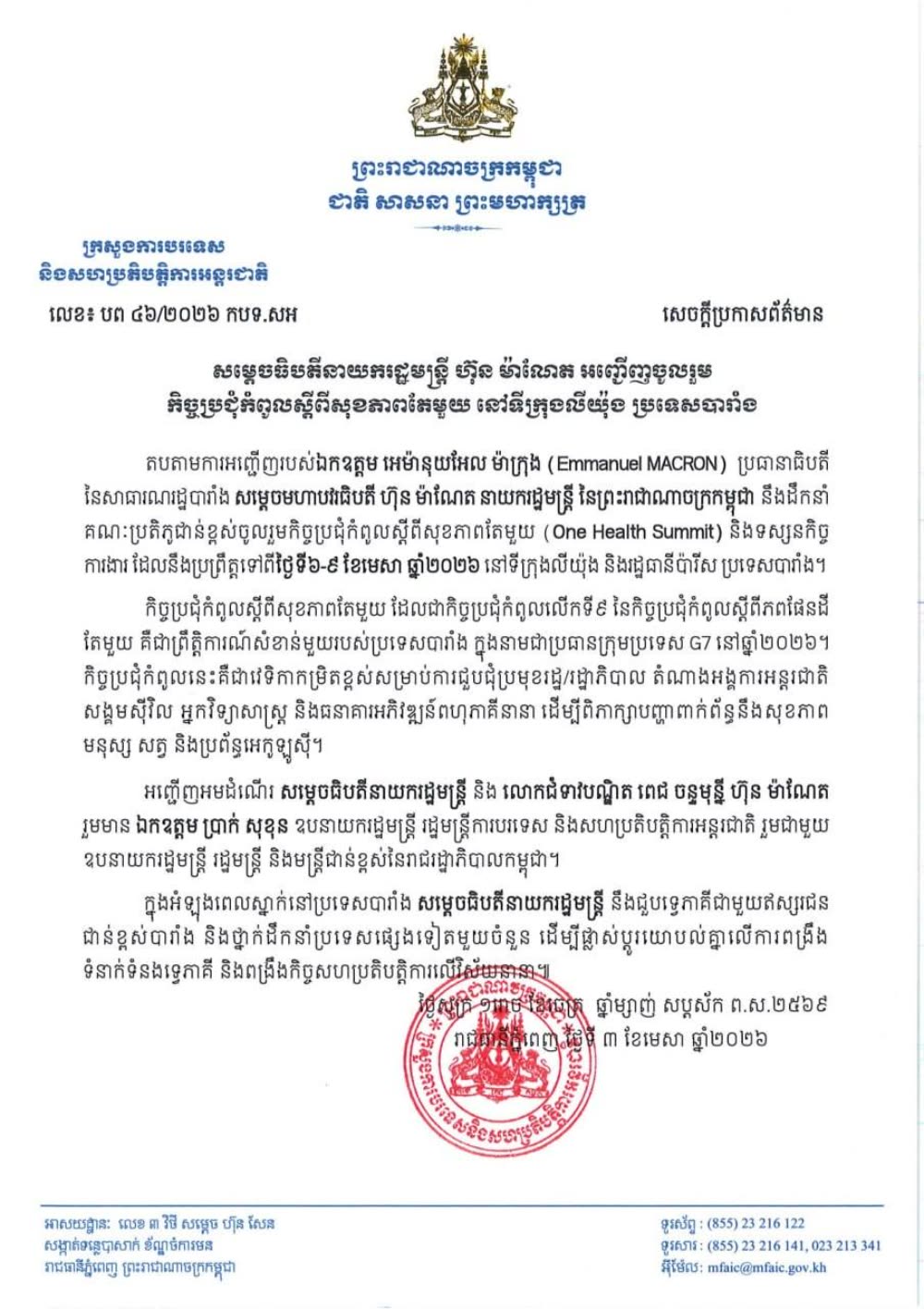 តបតាមការអញ្ជើញរបស់ឯកឧត្តម អេម៉ានុយអែល ម៉ាក្រុង (Emmanuel MACRON) ប្រធានាធិបតី នៃសាធារណរដ្ឋបារាំង សម្តេចមហាបវរធិបតី ហ៊ុន ម៉ាណែត នាយករដ្ឋមន្ត្រី នៃព្រះរាជាណាចក្រកម្ពុជា នឹងដឹកនាំ គណៈប្រតិភូជាន់ខ្ពស់ចូលរួមកិច្ចប្រជុំកំពូលស្តីពីសុខភាពតែមួយ (One Health Summit) និងទស្សនកិច្ច ការងារ ដែលនឹងប្រព្រឹត្តទៅពីថ្ងៃទី៦-៩ ខែមេសា ឆ្នាំ២០២៦ នៅទីក្រុងលីយ៉ុង និងរដ្ឋធានីប៉ារីស ប្រទេសបារាំង។