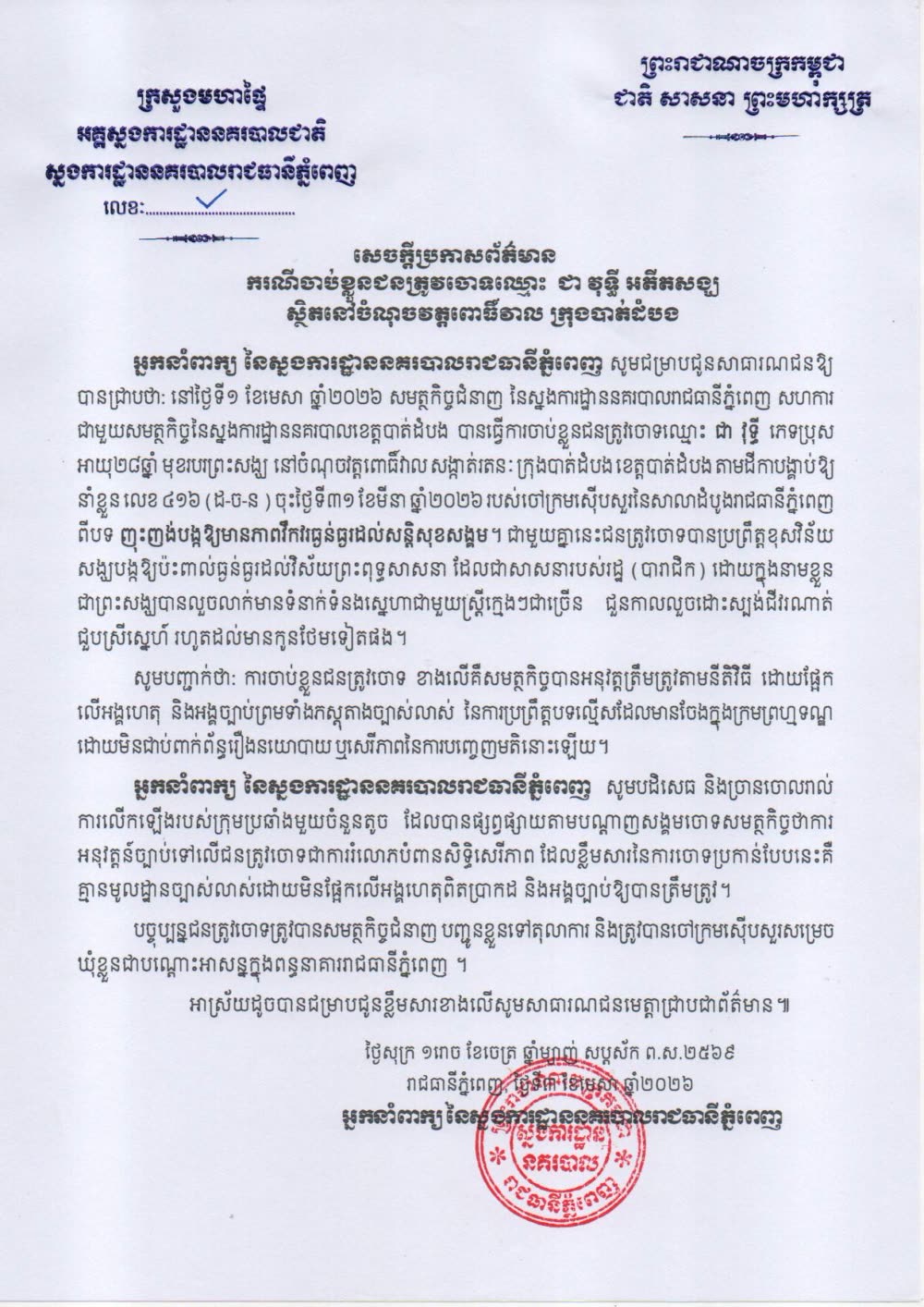 ស្នងការដ្ឋាននគរបាលរាជធានីភ្នំពេញ បានចេញសេចក្តីប្រកាសព័ត៌មាន ស្ដីពីករណីចាប់ខ្លួនជនត្រូវចោទឈ្មោះ ជា វុទ្ធី អតីតសង្ឃ ស្ថិតនៅចំណុចវត្តពោធិ៍វាល ក្រុងបាត់ដំបង ជូនសាធារណជនឱ្យ បានជ្រាបថា: នៅថ្ងៃទី១ ខែមេសា ឆ្នាំ២០២៦ សមត្ថកិច្ចជំនាញ នៃស្នងការដ្ឋាននគរបាលរាជធានីភ្នំពេញ សហការ ជាមួយសមត្ថកិច្ចនៃស្នងការដ្ឋាននគរបាលខេត្តបាត់ដំបង បានធ្វើការចាប់ខ្លួនជនត្រូវចោទឈ្មោះ ជា វុទ្ធី ភេទប្រុស អាយុ២៨ឆ្នាំ មុខរបរព្រះសង្ឃ នៅចំណុចវត្តពោធិ៍វាល សង្កាត់រតនៈ ក្រុងបាត់ដំបង ខេត្តបាត់ដំបង តាមដីកាបង្គាប់ឱ្យ នាំខ្លួន លេខ ៤១៦ (ដ-ច-ន) ចុះថ្ងៃទី៣១ ខែមីនា ឆ្នាំ២០២៦ របស់ចៅក្រមស៊ើបសួរនៃសាលាដំបូងរាជធានីភ្នំពេញ ពីបទ ញុះញង់បង្កឱ្យមានភាពវឹកវរធ្ងន់ធ្ងរដល់សន្តិសុខសង្គម។ ជាមួយគ្នានេះជនត្រូវចោទបានប្រព្រឹត្តខុសវិន័យ សង្ឃបង្កឱ្យប៉ះពាល់ធ្ងន់ធ្ងរដល់វិស័យព្រះពុទ្ធសាសនា ដែលជាសាសនារបស់រដ្ឋ (បារាជិក) ដោយក្នុងនាមខ្លួន ជាព្រះសង្ឃបានលួចលាក់មានទំនាក់ទំនងស្នេហាជាមួយស្ត្រីក្មេងៗជាច្រើន ជួនកាលលួចដោះស្បង់ជីវរណាត់ ជួបស្រីស្នេហ៍ រហូតដល់មានកូនថែមទៀតផង។