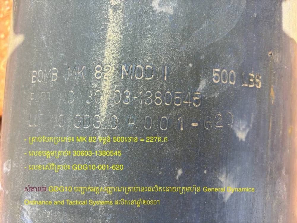 លោក ហេង រតនា បានបញ្ជាក់ឱ្យដឹងទៀតថា គ្រាប់បែក MK-82 នេះ បានកប់ក្នុងដីជម្រៅជាង១៣ម៉ែត្រ គ្រាប់បែកទម្លាក់ពីយន្តហោះ MK-82 ផលិតនៅឆ្នាំ២០១០ ដោយក្រុមហ៊ុន GDG (General Dynamics Ordnance and Tactical Systems)និងបានកែសម្រួលបំពាក់បន្ថែម សម្ភារបច្ចេកទេស របស់ក្រុមហ៊ុនកូរ៉េខាងត្បូង HWG(Hanwha Corporation) និងបានទម្លាក់លើមាតុភូមិកម្ពុជា ដោយទ័ពអាកាសសៀមឈ្លានពាននៅថ្ងៃទី១០ ខែធ្នូ ឆ្នាំ២០២៥ វេលាម៉ោងប្រមាណ៤រសៀល។