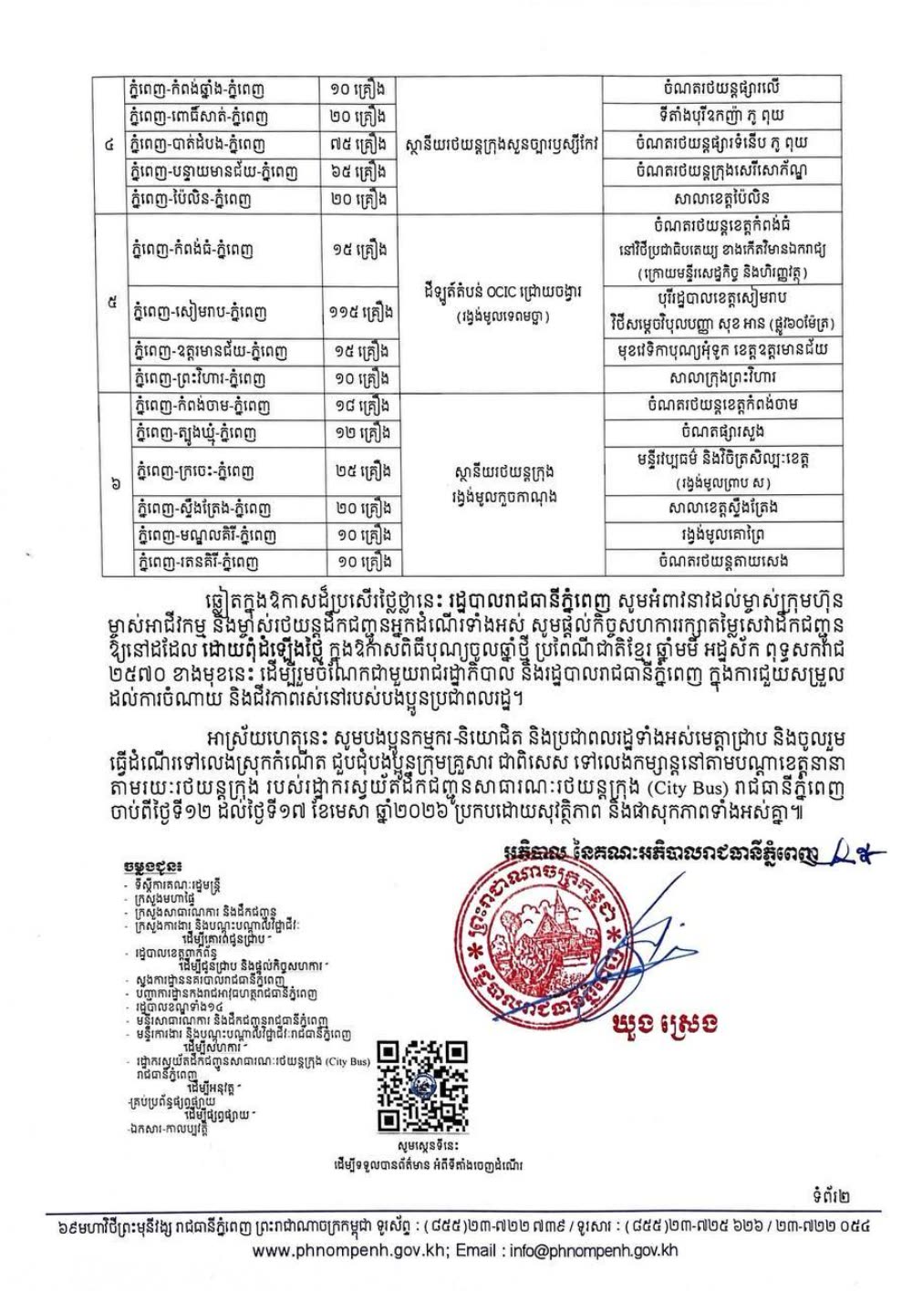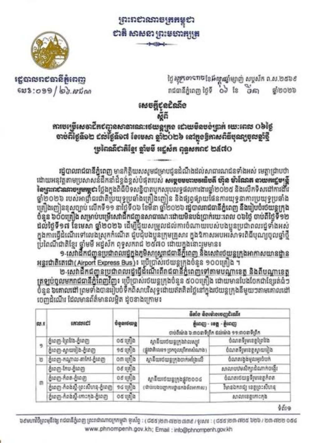 រដ្ឋបាលរាជធានីភ្នំពេញ បានរៀបចំរថយន្តក្រុង ចំនួន ៦០០គ្រឿង សម្រាប់បម្រើសេវាដឹកជញ្ជូនសាធារណៈដោយមិនបង់ប្រាក់រយៈពេល ០៦ថ្ងៃ ចាប់ពីថ្ងៃទី១២ ដល់ថ្ងៃទី១៧ ខែមេសា ឆ្នាំ២០២៦ ដើម្បីជួយសម្រួលដល់ការចំណាយរបស់បងប្អូនប្រជាពលរដ្ឋទាំងអស់ ក្នុងការធ្វើដំណើរទៅលេងស្រុកកំណើត ជួបជុំបងប្អូនក្រុមគ្រួសារ ក្នុងឱកាសអបអរសាទរពិធីបុណ្យចូលឆ្នាំថ្មី ប្រពៃណីជាតិខ្មែរ។