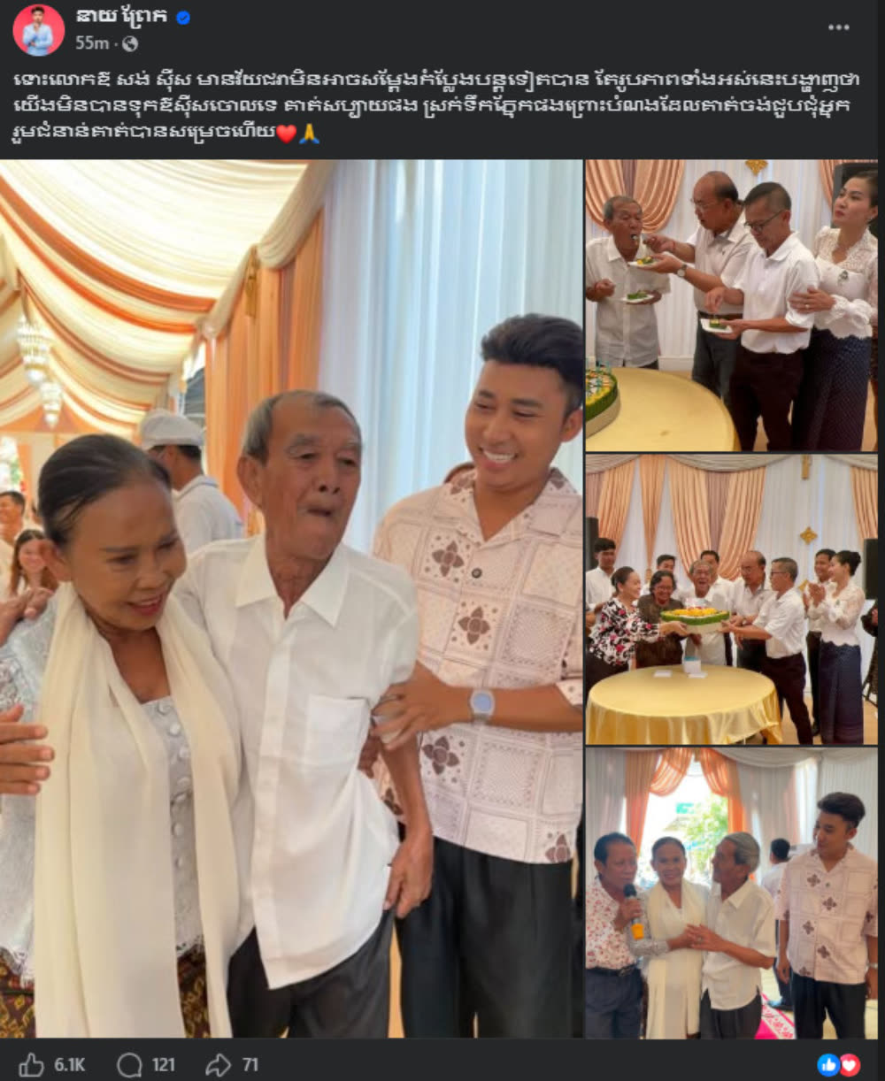 យ៉ាងណាមិញ បន្ទាប់ពីមើលឃើញនៅសកម្មភាពបែបនេះ នាយ ព្រែក ក៏បានបង្ហោះរូបភាពអបជាមួយសំណេរថា៖ «ទោះលោកឳ សង់ សុីស មានវ័យជរាមិនអាចសម្ដែងកំប្លែងបន្ដទៀតបាន តែរូបភាពទាំងអស់នេះបង្ហាញថាយើងមិនបានទុកឳសុីសចោលទេ គាត់សប្បាយផង ស្រក់ទឹកភ្នែកផងព្រោះបំណងដែលគាត់ចង់ជួបជុំអ្នករួមជំនាន់គាត់បានសម្រេចហើយ»។