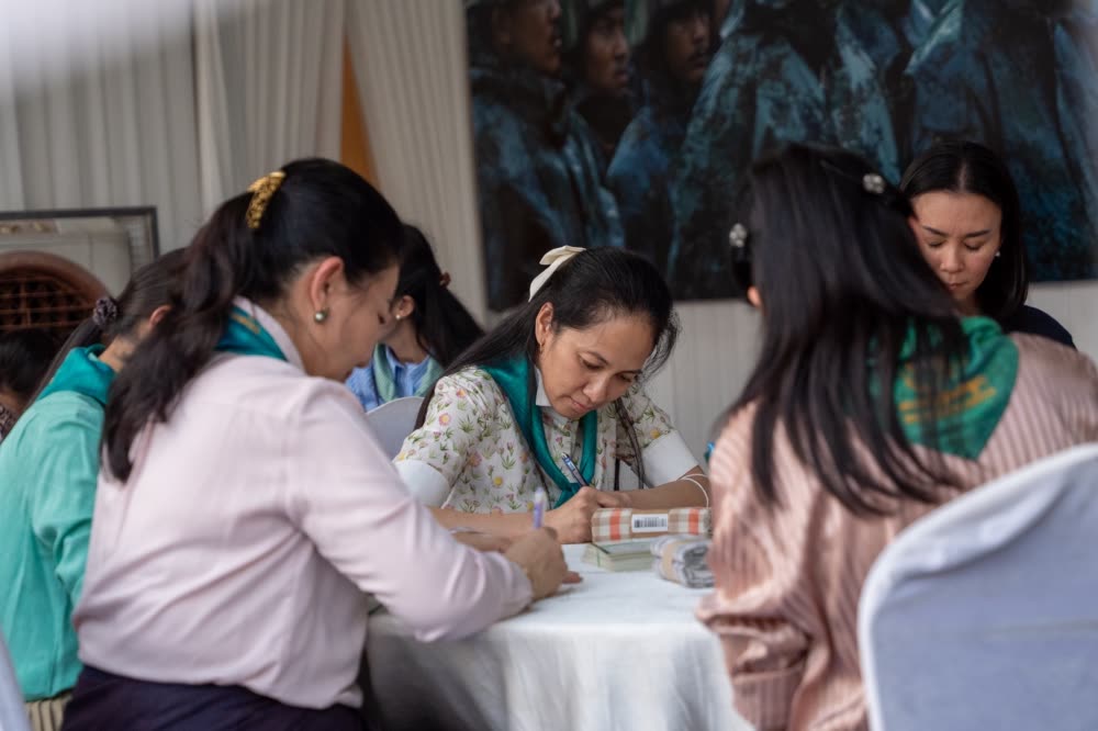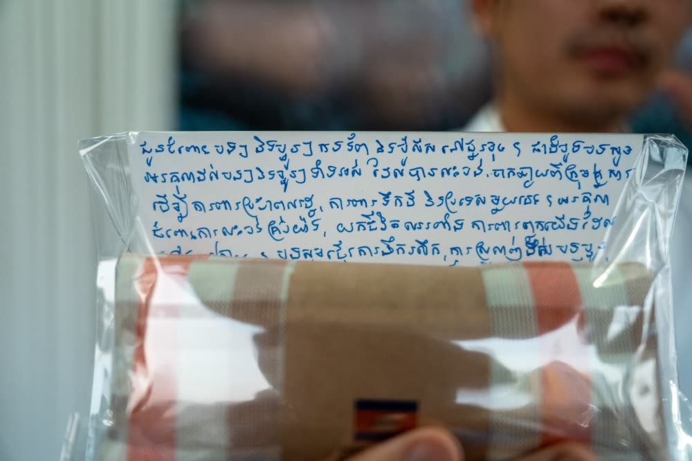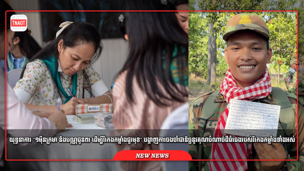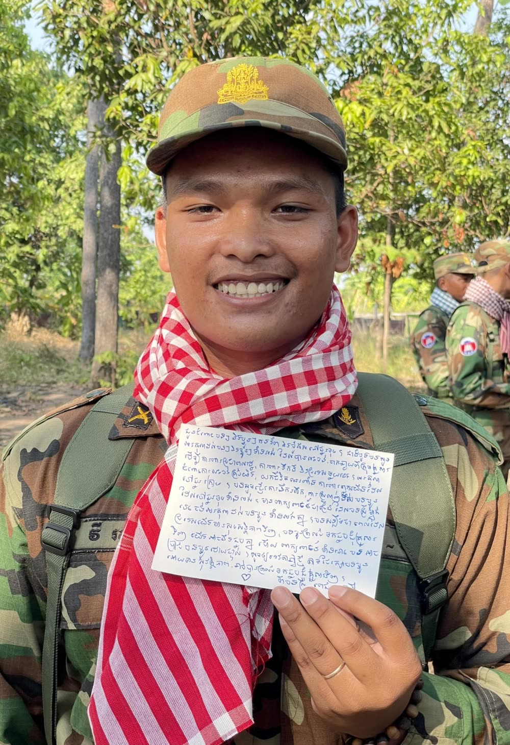 វីរៈកងទ័ពជួរ ឈ្មោះ វី រស្មី ជាទាហានដែរកំពុងឈរជើងការពារ នៅទិសខេត្តព្រះវិហារ បានទទួលសំបុត្រ របស់ ពេជ ចន្ទមុន្នី ហ៊ុនម៉ាណែត ដែលបានសសេរក្នុងយុទ្ធនាការ«១ម៉ឺនក្រមា» ដើម្បីចូលរួមសរសេរសំបុត្រជូនពរ និងដឹងគុណដល់វីរៈកងទ័ពជួរមុខកម្ពុជា។