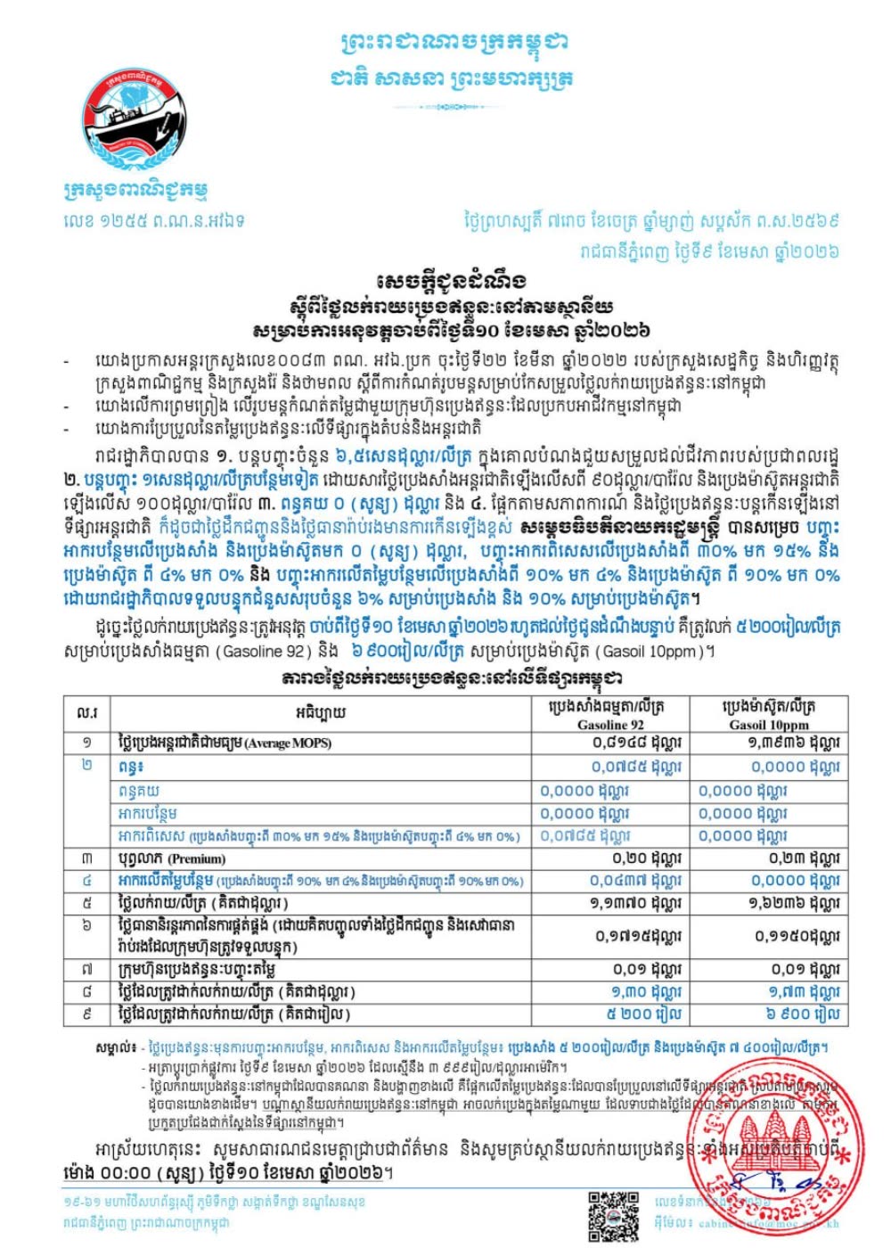ក្រសួងពាណិជ្ជកម្ម បានចេញសេចក្តីជូនដំណឹងស្តីពីថ្លៃលក់រាយប្រេងឥន្ធនៈនៅតាមស្ថានីយ សម្រាប់ការអនុវត្តចាប់ពីម៉ោង ០០:០០ (សូន្យ) ថ្ងៃទី១០ ខែមេសា ឆ្នាំ២០២៦ ដោយតម្លៃប្រេងសាំង ៥,២០០ រៀល/លីត្រ និងប្រេងម៉ាស៊ូត ៦,៩០០ រៀល/លីត្រ។