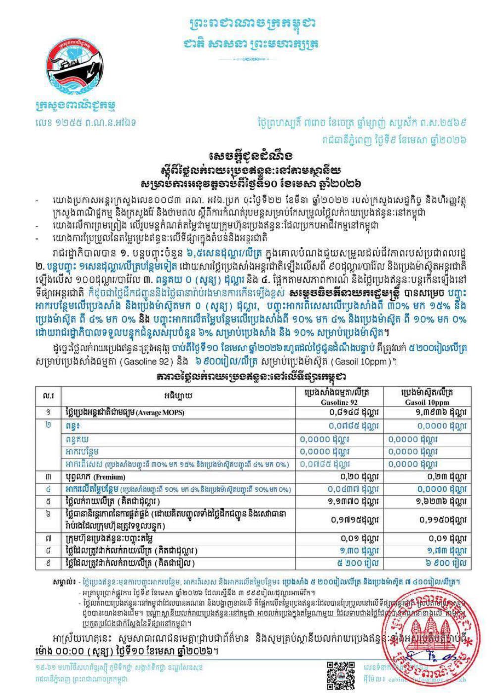 សេចក្តីជូនដំណឹង ស្តីពី ថ្លៃលក់រាយប្រេងឥន្ធនៈនៅតាមស្ថានីយ សម្រាប់ការអនុវត្តចាប់ពីម៉ោង ០០:០០ (សូន្យ) ថ្ងៃទី១០ ខែមេសា ឆ្នាំ២០២៦។