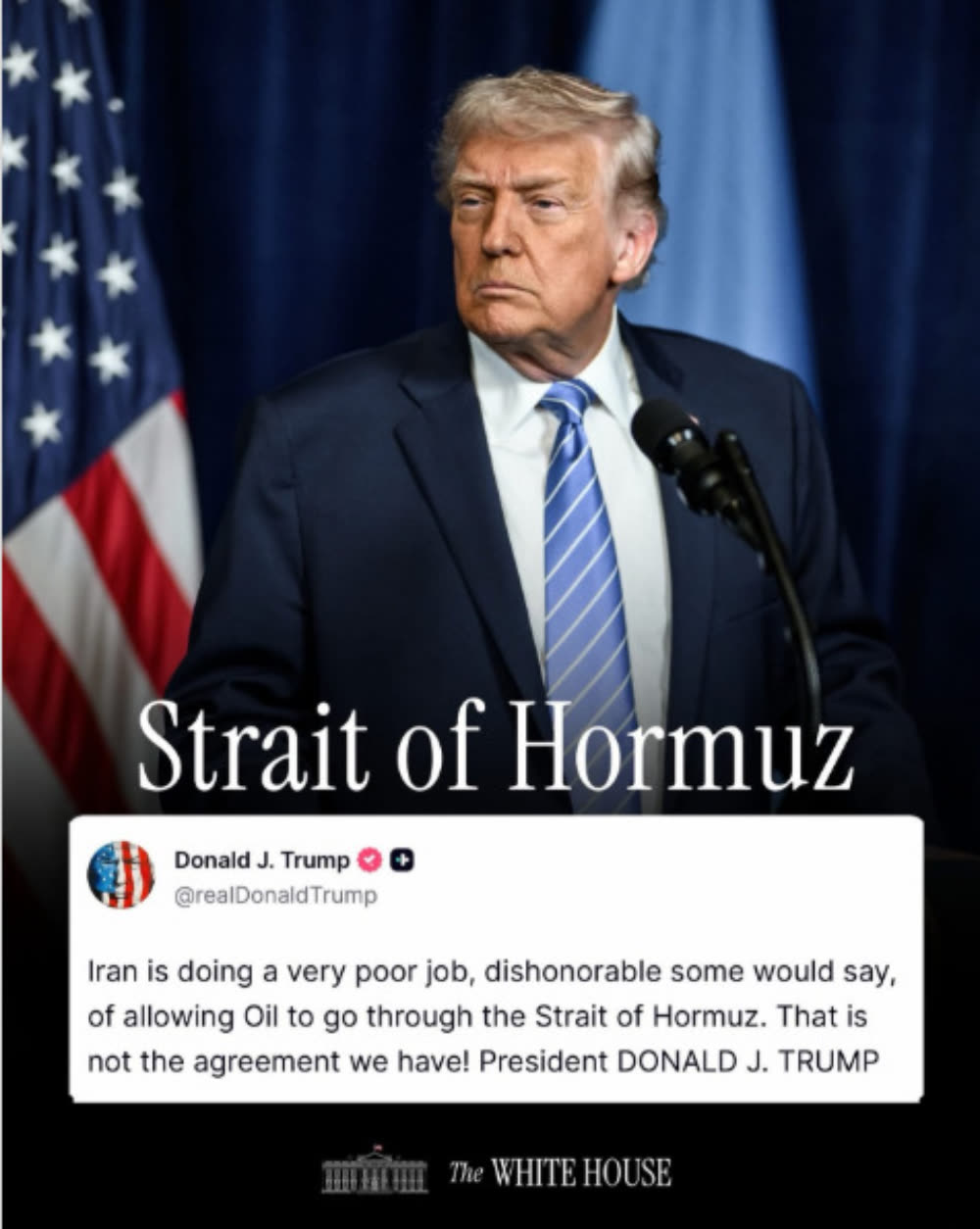 នៅក្នុងការបង្ហោះមួយលើ Truth Social លោក Trump បានសរសេរថា អ៊ីរ៉ង់កំពុងធ្វើការអន់ ជុំវិញការអនុញ្ញាតឱ្យនាវាប្រេងឆ្លងកាត់ច្រកសមុទ្រ Hormuz។ លោកបានបន្ថែមថា នោះមិនមែនជាកិច្ចព្រមព្រៀងដែលយើងមានទេ។ ការអត្ថាធិប្បាយទាំងនេះកើតឡើង ខណៈដែលភាពតានតឹងកំពុងផ្ទុះឡើងនៅលើភាគីទាំងពីរនៃបទឈប់បាញ់ដ៏ផុយស្រួយរយៈពេលពីរសប្តាហ៍។ លោក Trump ក៏បាននិយាយនៅក្នុងការបង្ហោះដាច់ដោយឡែកមួយថា មានរបាយការណ៍ថា អ៊ីរ៉ង់កំពុងគិតថ្លៃលើនាវាដឹកប្រេងដែលឆ្លងកាត់ច្រកសមុទ្រ Hormuz ហើយប្រសិនបើវាដូច្នោះមែន ប្រទេសនេះគួរតែបញ្ឈប់ជាបន្ទាន់។