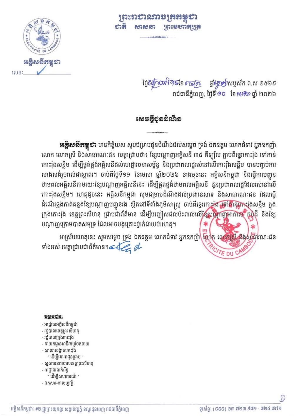 អគ្គិសនីកម្ពុជា បានភ្ជាប់ខ្សែកាបកប់បាតសមុទ្រតង់ស្យុង ៣៥គីឡូវ៉ុល ពីកោះរ៉ុង ទៅកោះរ៉ុងសន្លឹម និងដាក់ឱ្យដំណើការរួចរាល់ហើយ បន្ទាប់ពីសម្ដេចមហាបវរធិបតី ហ៊ុន ម៉ាណែត បានណែនាំឱ្យក្រសួងរ៉ែ និថាមពល ព្រមទាំងអគ្គិសនីកម្ពុជា សាងសង់ភ្ជាប់បណ្ដាញអគ្គិសនីទៅកាន់បណ្ដាកោះ នៅខេត្តព្រះសីហនុ និងការងារតភ្ជាប់នេះត្រូវបានអនុវត្តតាំងពីពាក់កណ្តាលឆ្នាំ ឆ្នាំ២០២៥ ហើយបានបញ្ចប់ដាក់ឱ្យដំណើការកាលពីថ្ងៃទី១១ ខែមេសា ឆ្នាំ២០២៦ដើម្បីជួយសំរួលជីវភាពដល់ប្រជាពលរដ្ឋ ជាពិសេសនៅតំបន់ដាច់ស្រយាល ដូចជាបណ្តាកោះជាដើម។