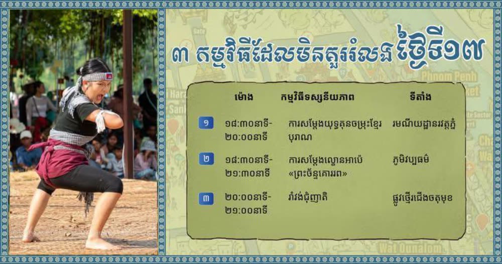 ជាក់ស្តែង កម្មវិធីដែលមិនគួររំលងក្នុងព្រឹត្តិការណ៍នគរសង្ក្រាន្តឆ្នាំ២០២៦ មានដូចជាថ្ងៃទី១៤ ខែមេសា មានដូចជា ១. កម្មវិធីទទួលទេវតា នៅទីតាំងរមណីយដ្ឋានវត្តភ្នំ, ២. កម្មវិធីទាញព្រ័ត្រមិត្តភាពនគរសង្ក្រាន្ត នៅទីតាំង ផ្លូវថ្មើរជើងចតុមុខ និង៣. កម្មវិធីការសម្តែងល្ខោនក្បាច់បុរាណ (ព្រះទេវីចម្បាំង) ទីតាំងភូមិវប្បធម៌ (សួនវឌ្ឍនៈ)។ ថ្ងៃទី១៥ ខែមេសា មានកម្មវិធីដូចជា ១. កម្មវិធីវេរភត្តប្រគេនព្រះសង្ឃ និងវាលុកចេតិយ (ពូនភ្នំខ្សាច់) នៅទីតាំងរមណីយដ្ឋានវត្តភ្នំ, ២. កម្មវិធី ក្បូនដង្ហែ (នគរសង្ក្រាន្ត) ទីតាំងផ្លូវថ្នើរជើងចតុមុខ និង៣. ការសម្តែងល្ខោនយីកេ (អ្នកតាឃ្លាំងមឿង) ទីតាំងភូមិវប្បធម៌។