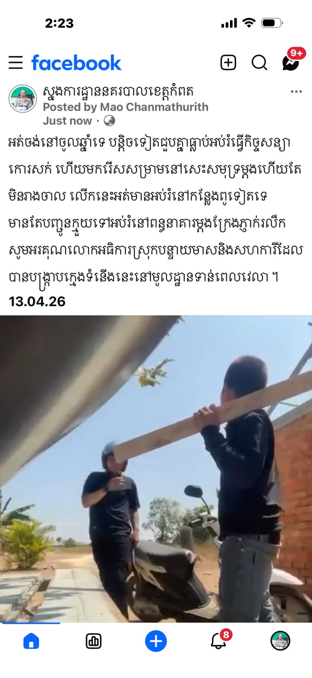 ស្នងការដ្ឋាននគរបាលខេត្តកំពត៖ «អត់ចង់នៅចូលឆ្នាំទេ បន្តិចទៀតជួបគ្នាធ្លាប់អប់រំធ្វើកិច្ចសន្យាកោរសក់ ហើយមករើសសម្រាមនៅសេះសមុទ្រម្តងហើយតែមិនរាងចាល លើកនេះអត់មានអប់រំនៅកន្លែងពូទៀតទេ មានតែបញ្ជូនក្មួយទៅអប់រំនៅពន្ធនាគារម្តងក្រែងភ្ញាក់រលឹក សូមអរគុណលោកអធិការស្រុកបន្ទាយមាសនិងសហការីដែលបានបង្ក្រាបក្មេងទំនើងនេះនៅមូលដ្ឋានទាន់ពេលវេលា 13.04.26»