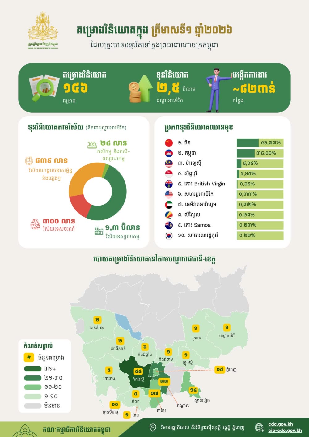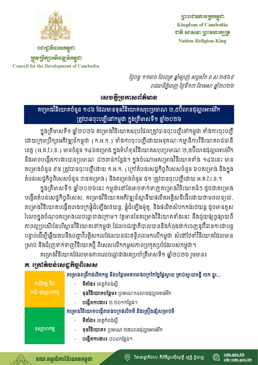 គម្រោងវិនិយោគចំនួន១៤៦ ដែលមានទុនវិនិយោគសរុបប្រមាណ ២,៥ប៊ីលានដុល្លារអាម៉េរិក ត្រូវបានចុះបញ្ជីនៅកម្ពុជា ក្នុងត្រីមាសទី១ ឆ្នាំ២០២៦ ដោយក្រុមប្រឹក្សាអភិវឌ្ឍន៍កម្ពុជា (ក.អ.ក.) និងអាចបង្កើតការងារបានប្រមាណ ៨២ពាន់កន្លែង។