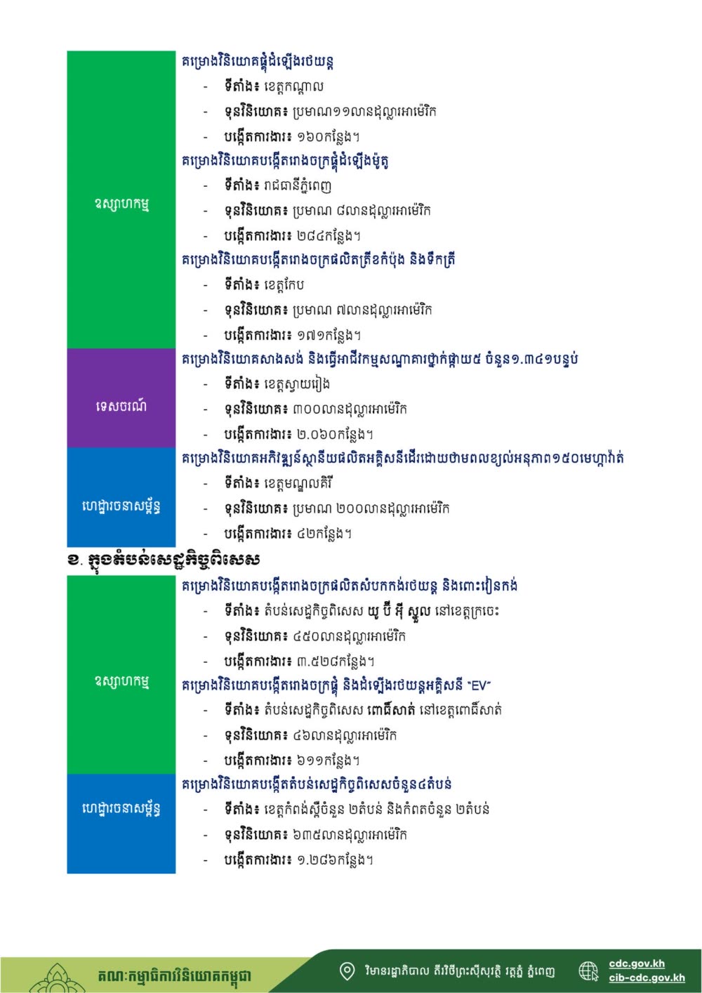 គម្រោងវិនិយោគដែលមានភាពលេចធ្លោជាងគេប្រចាំត្រីមាសទី១ ឆ្នាំ២០២៦ រួមមាន៖ ក. ក្រៅតំបន់សេដ្ឋកិច្ចពិសេស កសិកម្ម និង កសិ-ឧស្សាហកម្ម ឧស្សាហកម្ម គម្រោងពង្រីកផលិតកម្ម និងបន្ថែមអគាររោងចក្រកែច្នៃផ្លែស្វាយ គ្រាប់ស្វាយចន្ទី ចេក ខ្នុរ... ទីតាំង៖ ខេត្តកំពង់ស្ពឺ ទុនវិនិយោគបន្ថែម៖ ប្រមាណ១៤លានដុល្លារអាម៉េរិក បង្កើតការងារ៖ ២.២០១កន្លែង។ គម្រោងវិនិយោគបង្កើតរោងចក្រផលិតមី និងគ្រឿងផ្សំសម្រាប់មី ទីតាំង៖ ខេត្តកំពង់ស្ពឺ ទុនវិនិយោគ៖ ប្រមាណ ២៣លានដុល្លារអាម៉េរិក បង្កើតការងារ៖ ៨០៤កន្លែងផងដែរ៕