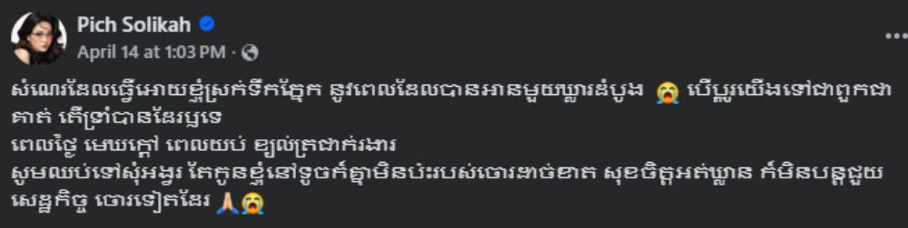 ក្រោយឃើញនៅសំណេរនេះហើយ តារាចម្រៀង ពេជ្រ សូលីកា បានលើកឡើងបន្តទាំងអួលណែនថា៖ «សំណេរដែលធ្វើអោយខ្ញុំស្រក់ទឹកភ្នែក នូវពេលដែលបានអានមួយឃ្លារដំបូង បើប្ដូរយើងទៅជាពួកជាគាត់ តើទ្រាំបានដែរឫទេ ពេលថ្ងៃ មេឃក្ដៅ ពេលយប់ ខ្យល់ត្រជាក់រងារ សូមឈប់ទៅសុំអង្វរ តែកូនខ្ញុំនៅទូចក៏គ្នាមិនប៉ះរបស់ចោរដាច់ខាត សុខចិត្តអត់ឃ្លាន ក៏មិនបន្តជួយសេដ្ឋកិច្ច ចោរទៀតដែរ»៕ អត្ថបទដោយ៖ Sun Darasy
