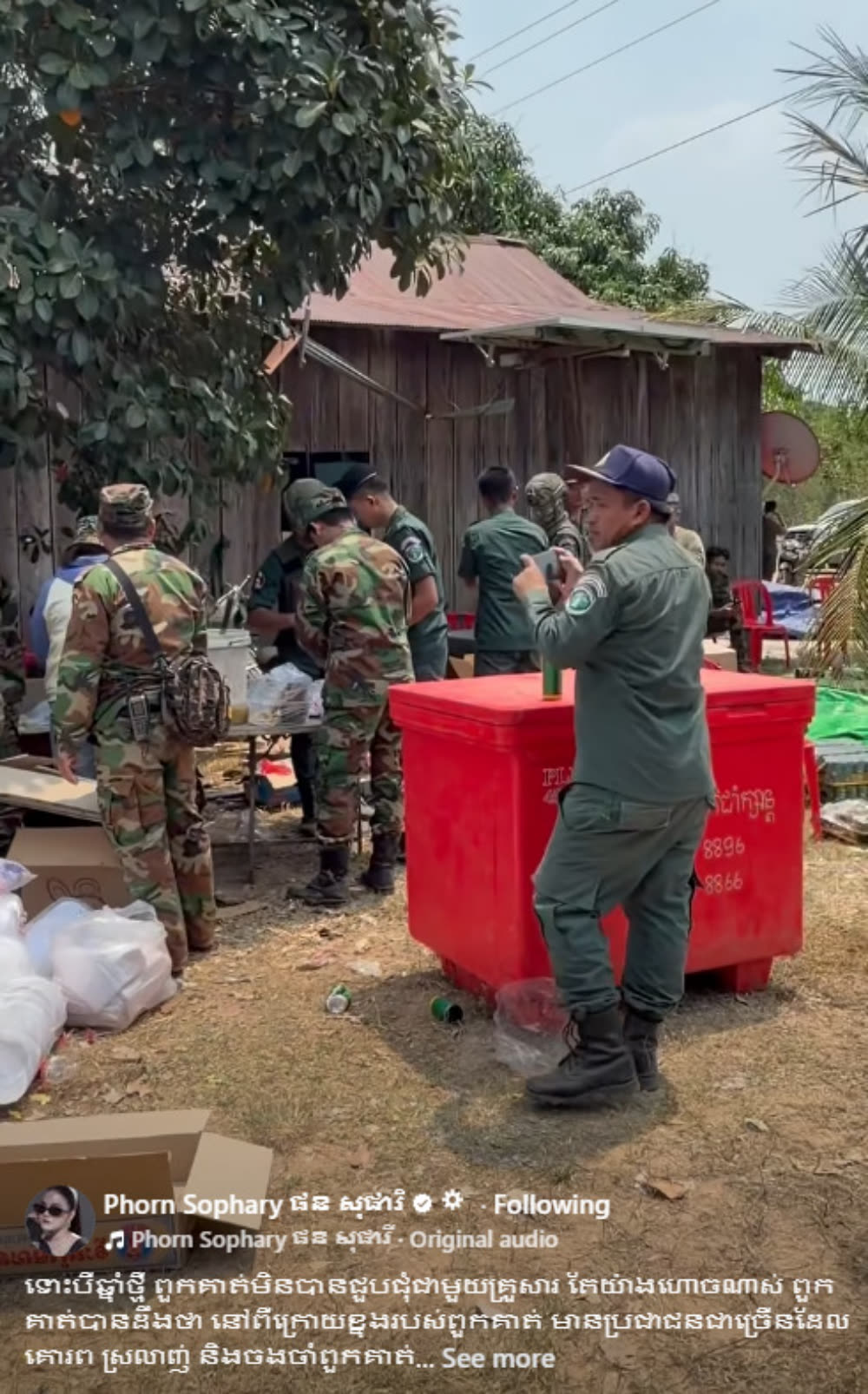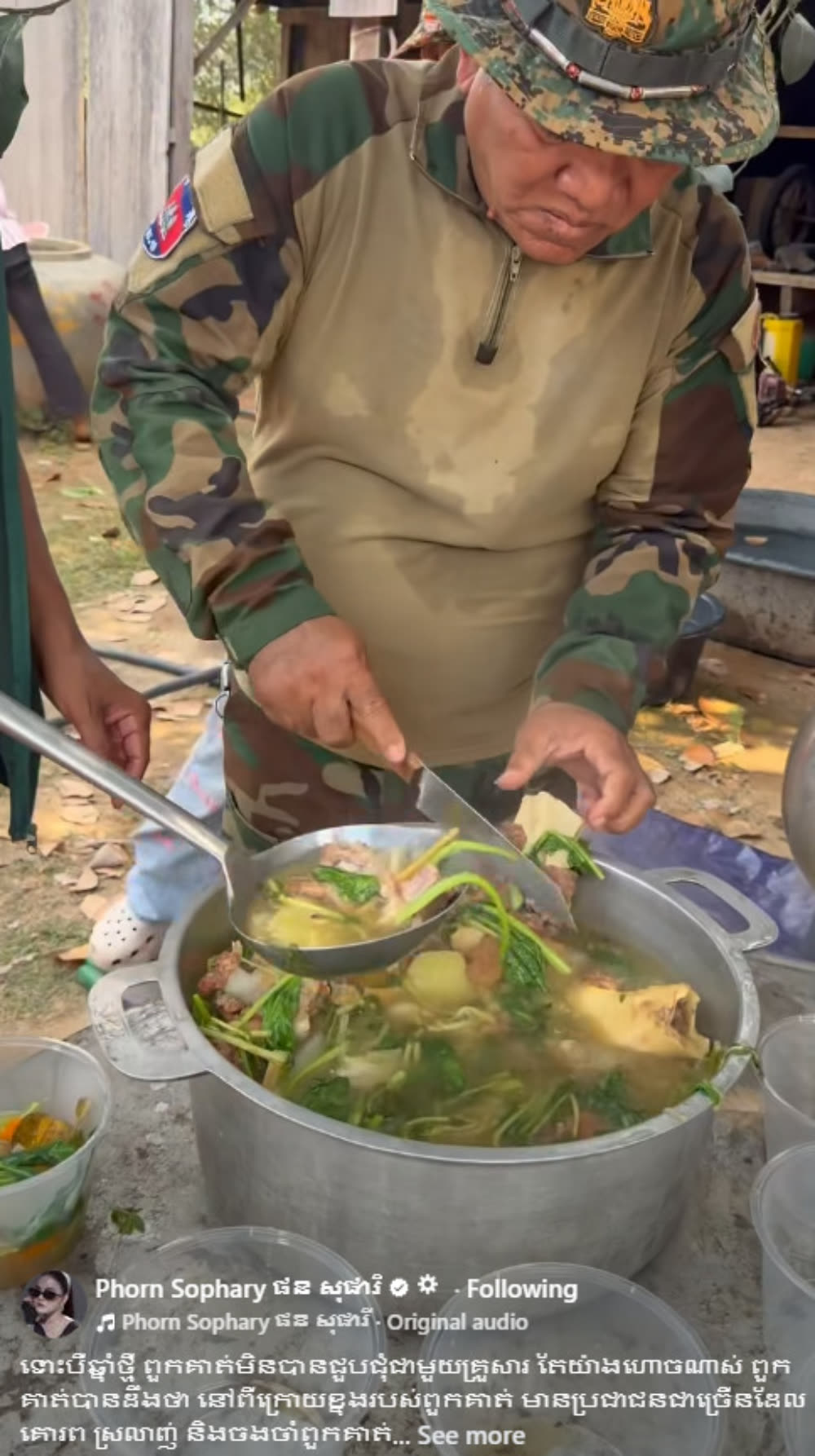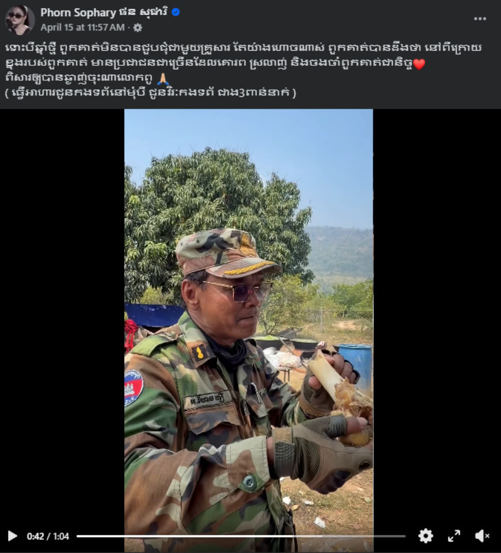 ដោយវីដេអូឃ្លីបដែល អ្នកនាង ផន សុផារី បានបង្ហោះចែកចាយក្នុងបណ្ដាញសង្គម អមជាមួយសំណេរថា៖ «ទោះបីឆ្នាំថ្មី ពួកគាត់មិនបានជួបជុំជាមួយគ្រួសារ តែយ៉ាងហោចណាស់ ពួកគាត់បានដឹងថា នៅពីក្រោយខ្នងរបស់ពួកគាត់ មានប្រជាជនជាច្រើនដែលគោរព ស្រលាញ់ និងចងចាំពួកគាត់ជានិច្ច ពិសារឲ្យបានឆ្ងាញ់ចុះណាលោកពូ ( ធ្វើអាហារជូនកងទព័នៅមុំបី ជូនវិរៈកងទព័ ជាង ៣ពាន់នាក់ )»។