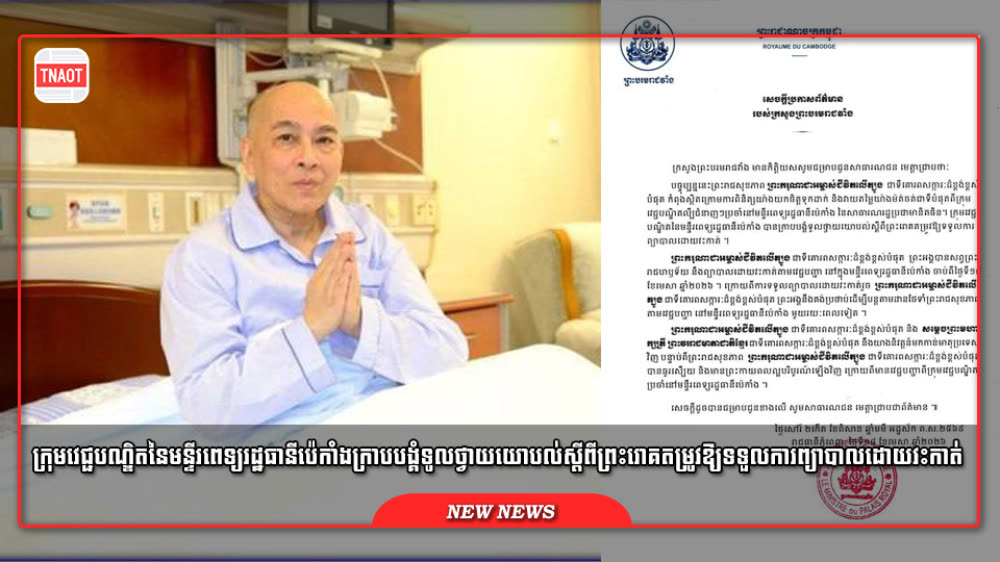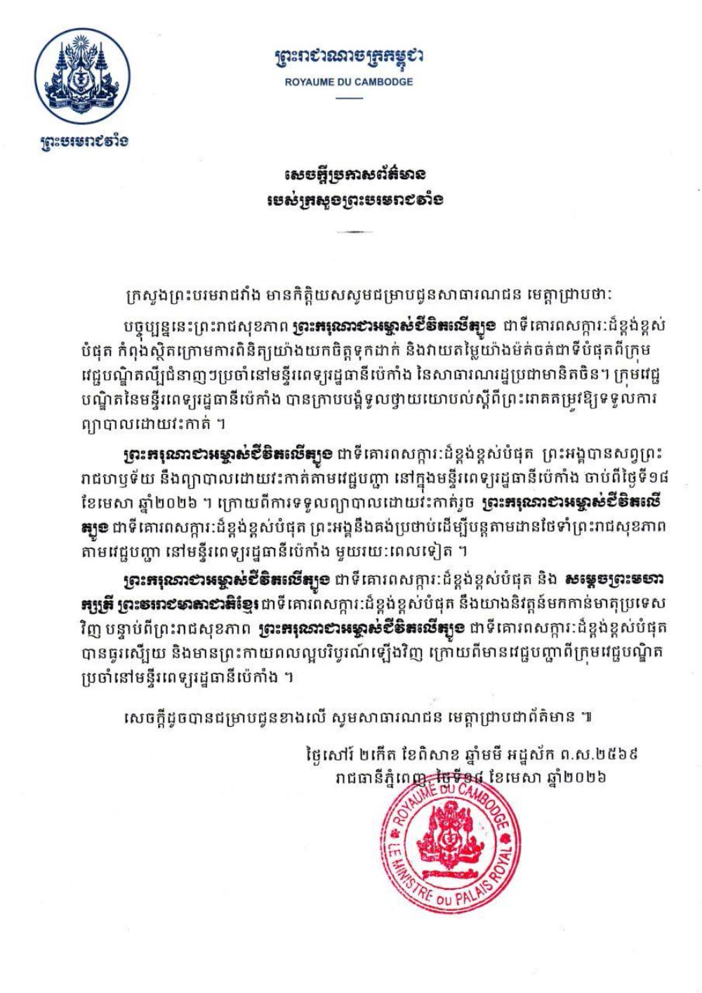 ព្រះករុណាជាអម្ចាស់ជីវិតលើត្បូង ជាទីគោរពសក្ការៈដ៏ខ្ពង់ខ្ពស់បំផុត ព្រះអង្គបានសព្វព្រះរាជហឫទ័យ នឹងព្យាបាលដោយវះកាត់តាមវេជ្ជបញ្ជា នៅក្នុងមន្ទីរពេទ្យរដ្ឋធានី ប៉េកាំង ចាប់ពីថ្ងៃទី១៨ ខែមេសា ឆ្នាំ២០២៦ ។