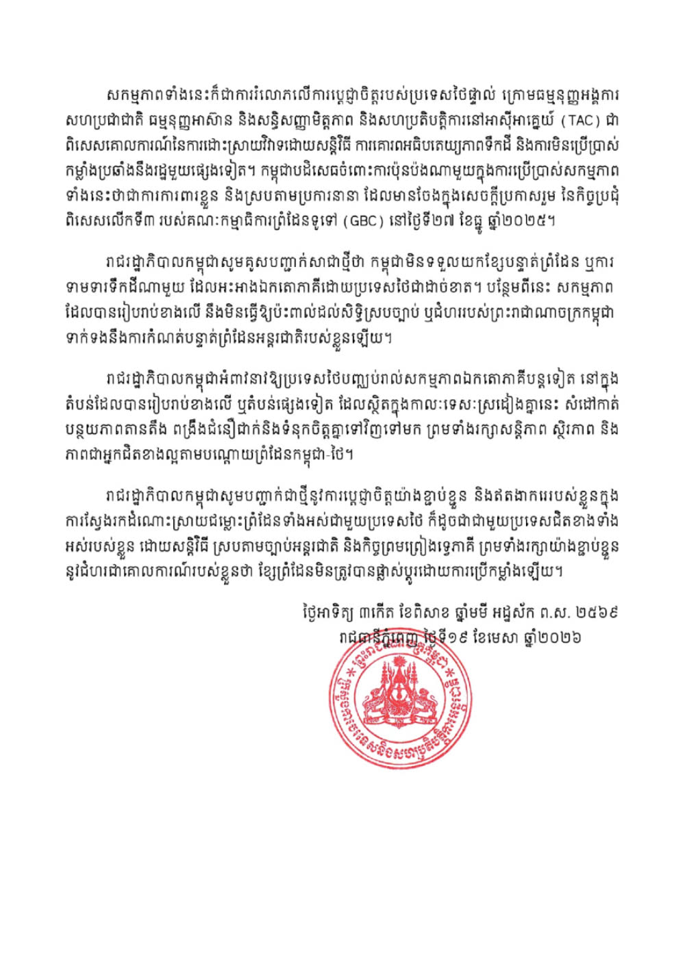 រាជរដ្ឋាភិបាលកម្ពុជា បញ្ជាក់ជាថ្មីនូវការប្តេជ្ញាចិត្តយ៉ាងខ្ជាប់ខ្ជួន និងឥតងាករេរបស់ខ្លួនក្នុង ការស្វែងរកដំណោះស្រាយជម្លោះព្រំដែនទាំងអស់ជាមួយប្រទេសថៃ ក៏ដូចជាជាមួយប្រទេសជិតខាងទាំង អស់របស់ខ្លួន ដោយសន្តិវិធី ស្របតាមច្បាប់អន្តរជាតិ និងកិច្ចព្រមព្រៀងទ្វេភាគី ព្រមទាំងរក្សាយ៉ាងខ្ជាប់ខ្ជួន នូវជំហរជាគោលការណ៍របស់ខ្លួនថា ខ្សែព្រំដែនមិនត្រូវបានផ្លាស់ប្តូរដោយការប្រើកម្លាំងឡើយ៕