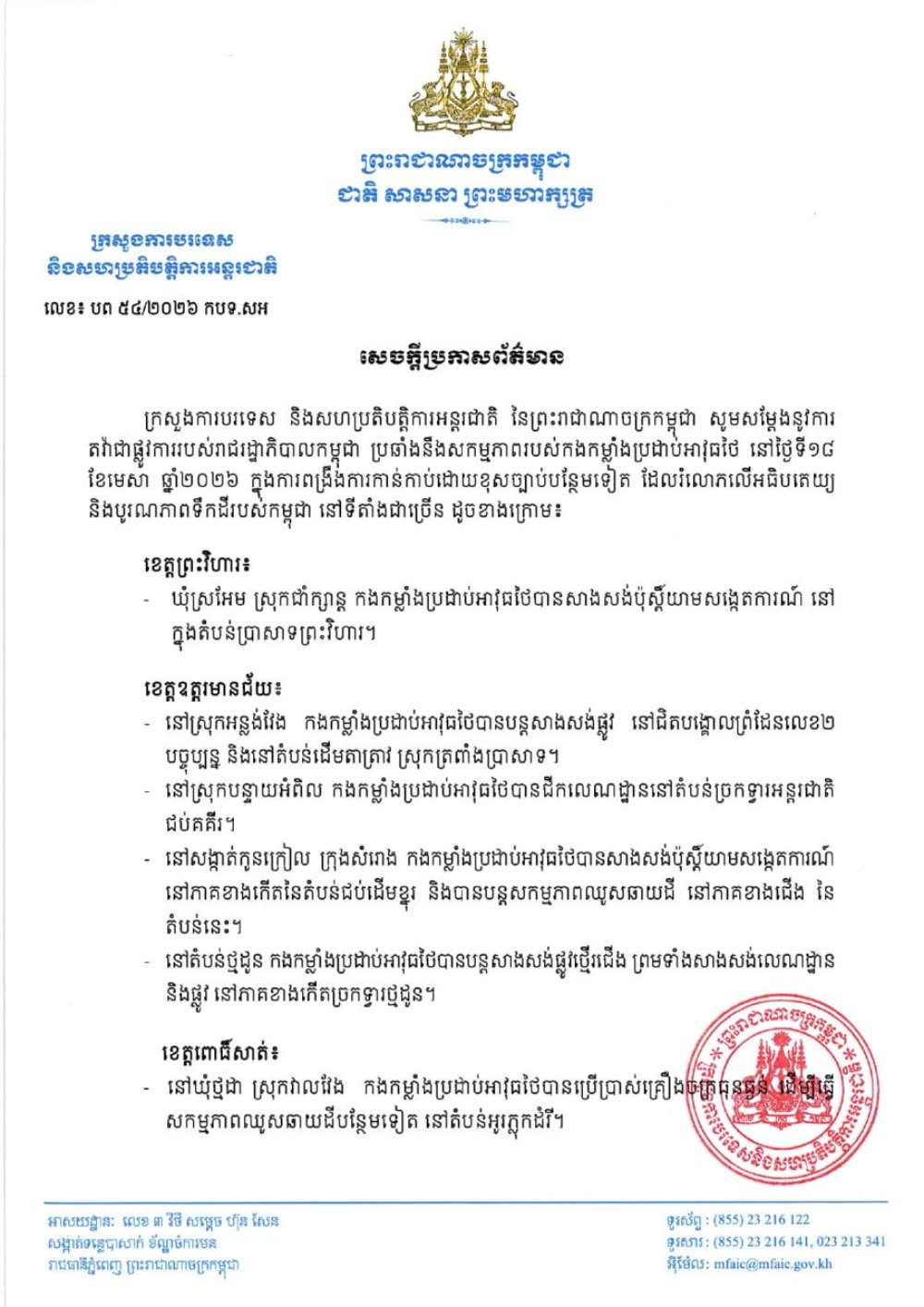 ក្រសួងការបរទេស និងសហប្រតិបត្តិការអន្តរជាតិ នៃព្រះរាជាណាចក្រកម្ពុជា សម្តែងនូវការ តវ៉ាជាផ្លូវការរបស់រាជរដ្ឋាភិបាលកម្ពុជា ប្រឆាំងនឹងសកម្មភាពរបស់កងកម្លាំងប្រដាប់អាវុធថៃ នៅថ្ងៃទី១៨ ខែមេសា ឆ្នាំ២០២៦ ក្នុងការពង្រឹងការកាន់កាប់ដោយខុសច្បាប់បន្ថែមទៀត ដែលរំលោភលើអធិបតេយ្យ និងបូរណភាពទឹកដីរបស់កម្ពុជា នៅទីតាំងជាច្រើន។