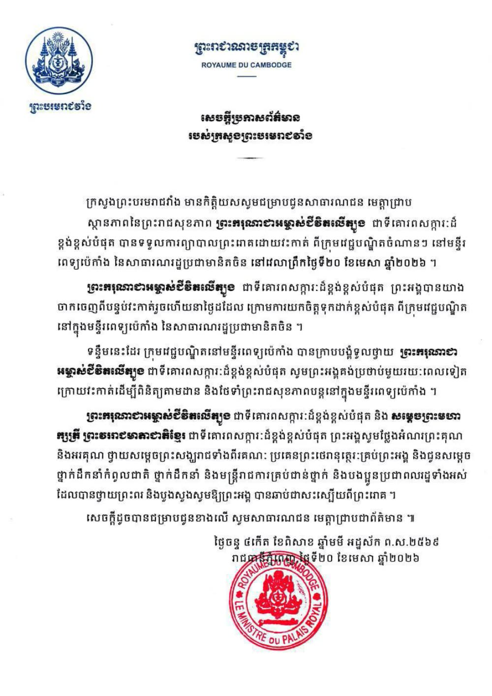 ក្រសួងព្រះបរមរាជវាំង បានចេញសេចក្តីប្រកាសព័ត៌មានស្តីពីស្ថានភាពនៃព្រះរាជសុខភាព ព្រះករុណាជាអម្ចាស់ជីវិតលើត្បូង ជាទីគោរពសក្ការៈដ៏ ខ្ពង់ខ្ពស់បំផុត បានទទួលការព្យាបាលព្រះរោគដោយវះកាត់ ពីក្រុមវេជ្ជបណ្ឌិតចំណានៗ នៅមន្ទីរ ពេទ្យប៉េកាំង នៃសាធារណរដ្ឋប្រជាមានិតចិន នៅវេលាព្រឹកថ្ងៃទី២០ ខែមេសា ឆ្នាំ២០២៦។