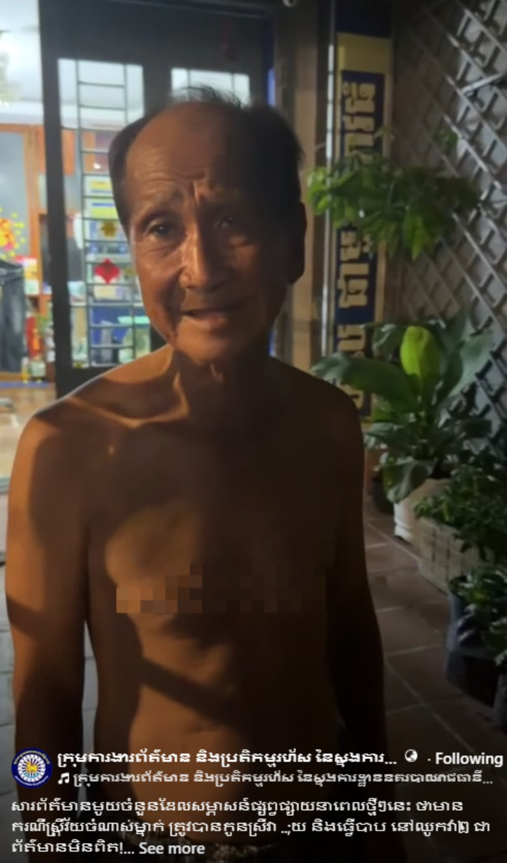បើយោងតាមបំភ្លឺរបស់បុរសចំណាស់ជាប្តីរបស់ស្ត្រីចំណាស់ខាងលើ បានរៀបរាប់ឲ្យដឹងថា គាត់និងប្រពន្ធគឺបច្ចុប្បន្ន រស់នៅក្នុងមូលដ្ឋានខណ្ឌ៧មករា ប្រពន្ធខ្លួនមានបញ្ហាវង្វេងស្មារតីច្រើន ហើយក្នុងគ្រួសារពុំមានអ្នកណាវាយ ឬធ្វើបាបគាត់នោះឡើយ គឺគាត់មានជំងឺស្វិតដៃជាយូរមកហើយ ដោយដៃគាត់ដែលមានស្លាកស្នាមរងបូសគឺកាលពីពេលថ្មីៗគាត់រអិលជើងធ្លាក់ពីលើកាំជណ្តើរផ្ទះជួលនៅខណ្ឌ៧មករា បណ្តាលឲ្យរបួសជាំដៃ។