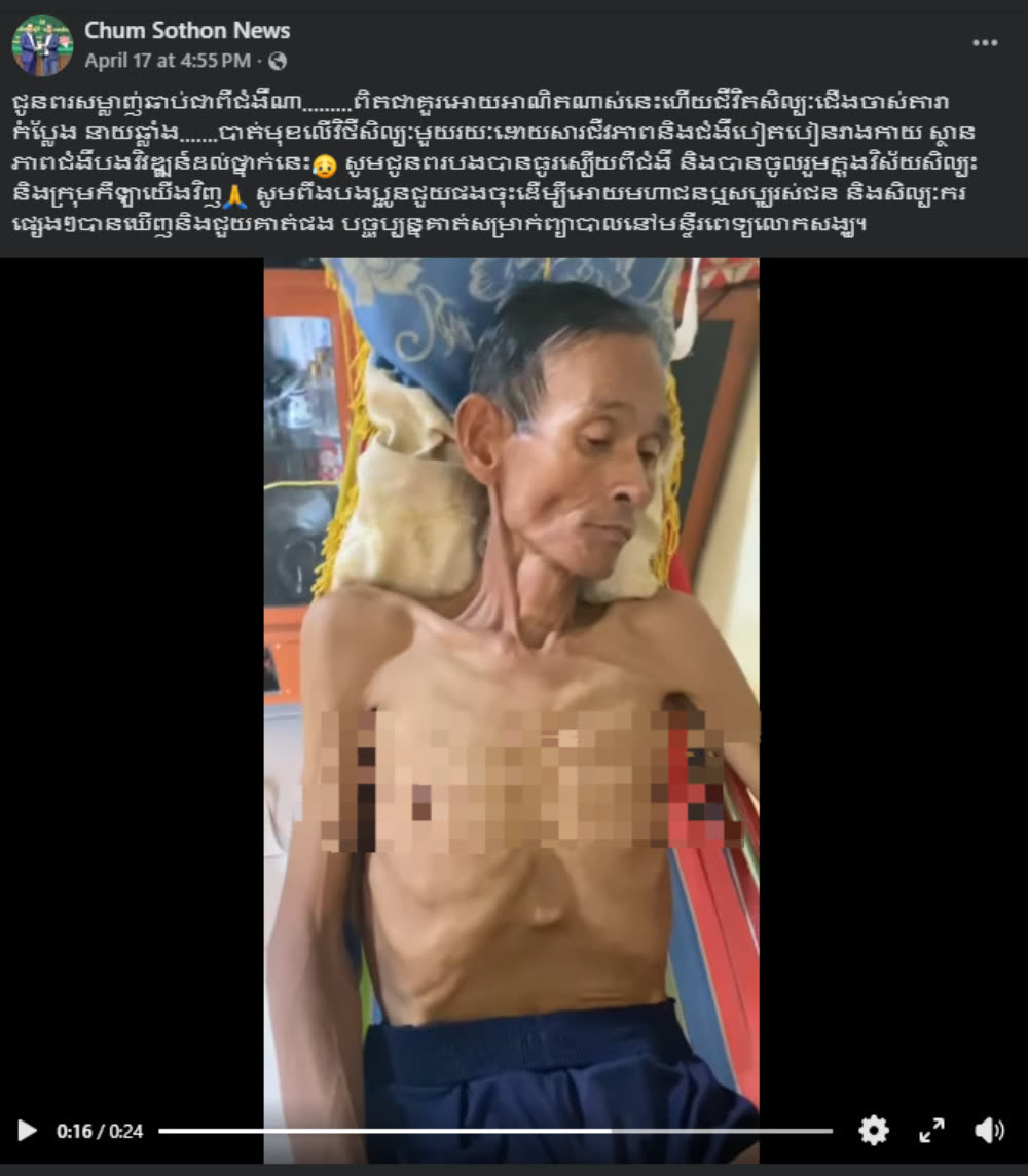សម្តេចតេជោ ហ៊ុន សែន និងសម្ដេចកិត្តិព្រឹទ្ធបណ្ឌិត ប៊ុន រ៉ានី ហ៊ុន សែន បានឧបត្ថម្ភថវិកាចំនួន ២០លានរៀន តាមរយៈប្រធានអង្គការមជ្ឍមណ្ឌលវប្បធម៍ខ្មែរកម្ពុជាក្រោម ជូនដល់ តារាកំប្លែង នាយឆ្លាំង ដែលកំពុងតែសម្រាកព្យាបាលនៅមន្ទីរពេទ្យលោកសង្ឃ ដោយសភាពនាពេលនេះហាក់ស្គមស្គាំងខ្លាំងមើលសឹងតែមិនស្គាល់ ក្រោយបាត់មុខពីសិល្បៈអស់រយៈពេលជាយូរឆ្នាំ ធ្វើឲ្យមហាជនឃើញហើយហាក់ស្រឡាំងកាំង និងបង្ហាញការព្រួយបារម្ភជាខ្លាំង។