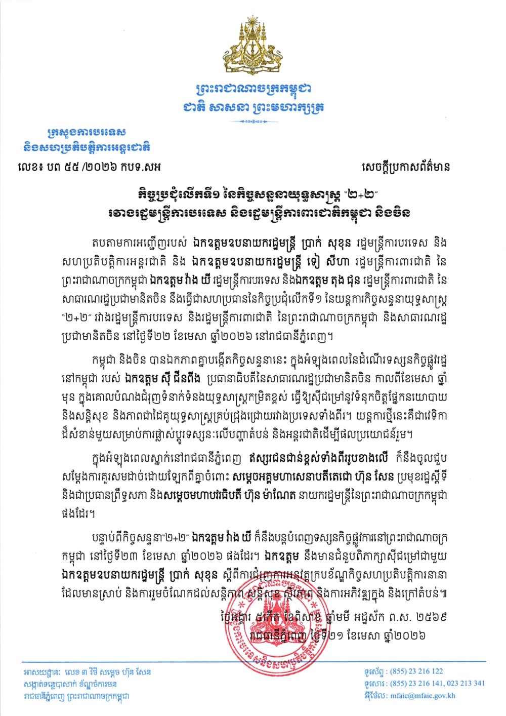 តបតាមការអញ្ជើញរបស់ ឯកឧត្តមឧបនាយករដ្ឋមន្ត្រី ប្រាក់ សុខុន រដ្ឋមន្ត្រីការបរទេស និង សហប្រតិបត្តិការអន្តរជាតិ និង ឯកឧត្តមឧបនាយករដ្ឋមន្ត្រី ទៀ សីហា រដ្ឋមន្ត្រីការពារជាតិ ន ព្រះរាជាណាចក្រកម្ពុជា ឯកឧត្ដម វ៉ាង យី រដ្ឋមន្ត្រីការបរទេស និងឯកឧត្តម តុង ជុន រដ្ឋមន្ត្រីការពារជាតិ នៃសាធារណរដ្ឋប្រជាមានិតចិន នឹងធ្វើជាសហប្រធាននៃកិច្ចប្រជុំលើកទី១ នៃយន្តការកិច្ចសន្ទនាយុទ្ធសាស្ត “២+២“ រវាងរដ្ឋមន្ត្រីការបរទេស និងរដ្ឋមន្ត្រីការពារជាតិ នៃព្រះរាជាណាចក្រកម្ពុជា និងសាធារណរដ្ឋ ប្រជាមានិតចិន នៅថ្ងៃទី២២ ខែមេសា ឆ្នាំ២០២៦ នៅរាជធានីភ្នំពេញ។