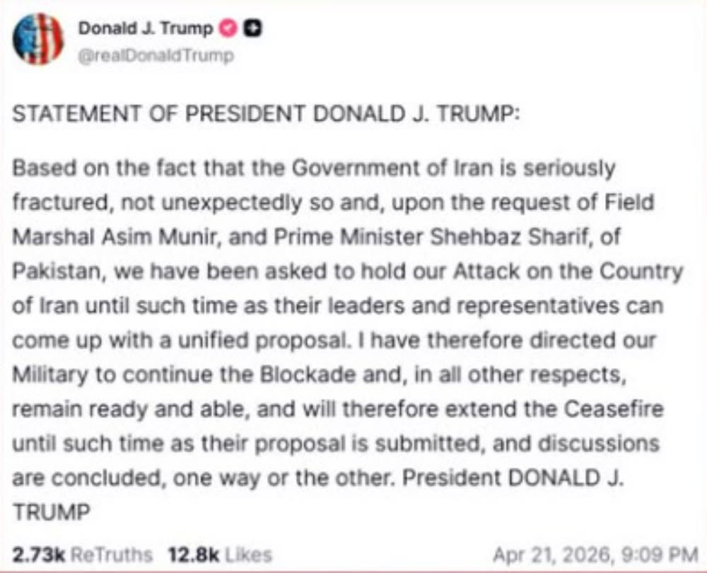 លោក Trump បានបញ្ជាក់នៅលើ Truth Social ថា លោកបានដឹកនាំយោធាសហរដ្ឋអាមេរិកបន្តការបិទផ្លូវ ហើយក្នុងគ្រប់ទិដ្ឋភាពផ្សេងទៀតនៅតែត្រៀមខ្លួន និងរក្សាការបិទផ្លូវកងទ័ពជើងទឹកនៃកំពង់ផែអ៊ីរ៉ង់ និងច្រកសមុទ្រ Hormuz ឲ្យនៅដដែល។ លោកបានកត់សម្គាល់ថា ការពង្រីកនេះអនុញ្ញាតឱ្យមានពេលវេលាសម្រាប់ថ្នាក់ដឹកនាំដែលបែកបាក់យ៉ាងធ្ងន់ធ្ងររបស់អ៊ីរ៉ង់ដើម្បីបង្រួបបង្រួម ចំពេលមានការចរចាជាប់គាំង ដែលអ៊ីរ៉ង់ស្ទាក់ស្ទើរក្នុងការបន្ត។ មេបញ្ជាការកងទ័ពប៉ាគីស្ថាន Field Marshal Asim Munir និងនាយករដ្ឋមន្ត្រី Shehbaz Sharif បានស្នើសុំពន្យារពេលការវាយប្រហារលើអ៊ីរ៉ង់រហូតដល់មេដឹកនាំ និងតំណាងអ៊ីរ៉ង់អាចឈានដល់សំណើរួបរួម។