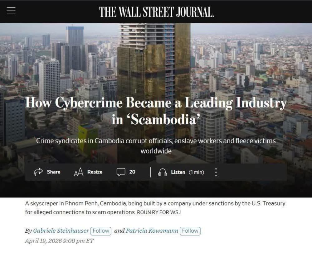 អ្នកនាំពាក្យក្រសួងព័ត៌មានកម្ពុជា លោក ទេព អស្នារិទ្ធ សម្ដែងសោកស្ដាយចំពោះអត្ថបទចុះផ្សាយដោយ The Wall Street Journal ដែលពាក់ព័ន្ធនឹងបញ្ហាឧក្រិដ្ឋកម្មអនឡាញ ដោយប្រើប្រាស់ភាសា និងការបញ្ជាក់នៅក្នុងអត្ថបទនោះប៉ះពាល់ដល់កិត្តិយស និងអត្តសញ្ញាណជាតិរបស់កម្ពុជា។