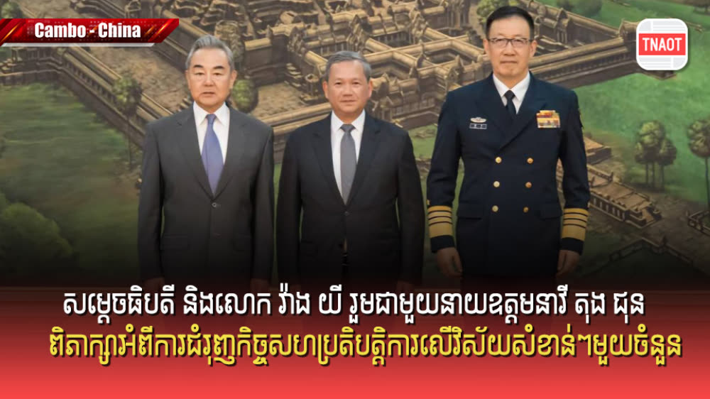 សម្ដេចធិបតីក៏បានជម្រាបជូនលោក វ៉ាង យី ឯកឧត្តមនាយឧត្តមនាវី តុង ជុន និងគណៈប្រតិភូ អំពីការវិវត្តថ្មីៗនៃស្ថានភាពព្រំដែនកម្ពុជា-ថៃ និងបានបញ្ជាក់សាជាថ្មីនូវជំហររបស់កម្ពុជា ក្នុងការដោះស្រាយបញ្ហាព្រំដែនដោយសន្តិវិធី ផ្អែកលើច្បាប់អន្តរជាតិ និងអនុលោមតាមអនុសញ្ញា សន្ធិសញ្ញា និង កិច្ចព្រមព្រៀងទ្វេភាគីដែលមាន ស្រាប់រវាងកម្ពុជា-ថៃ៕