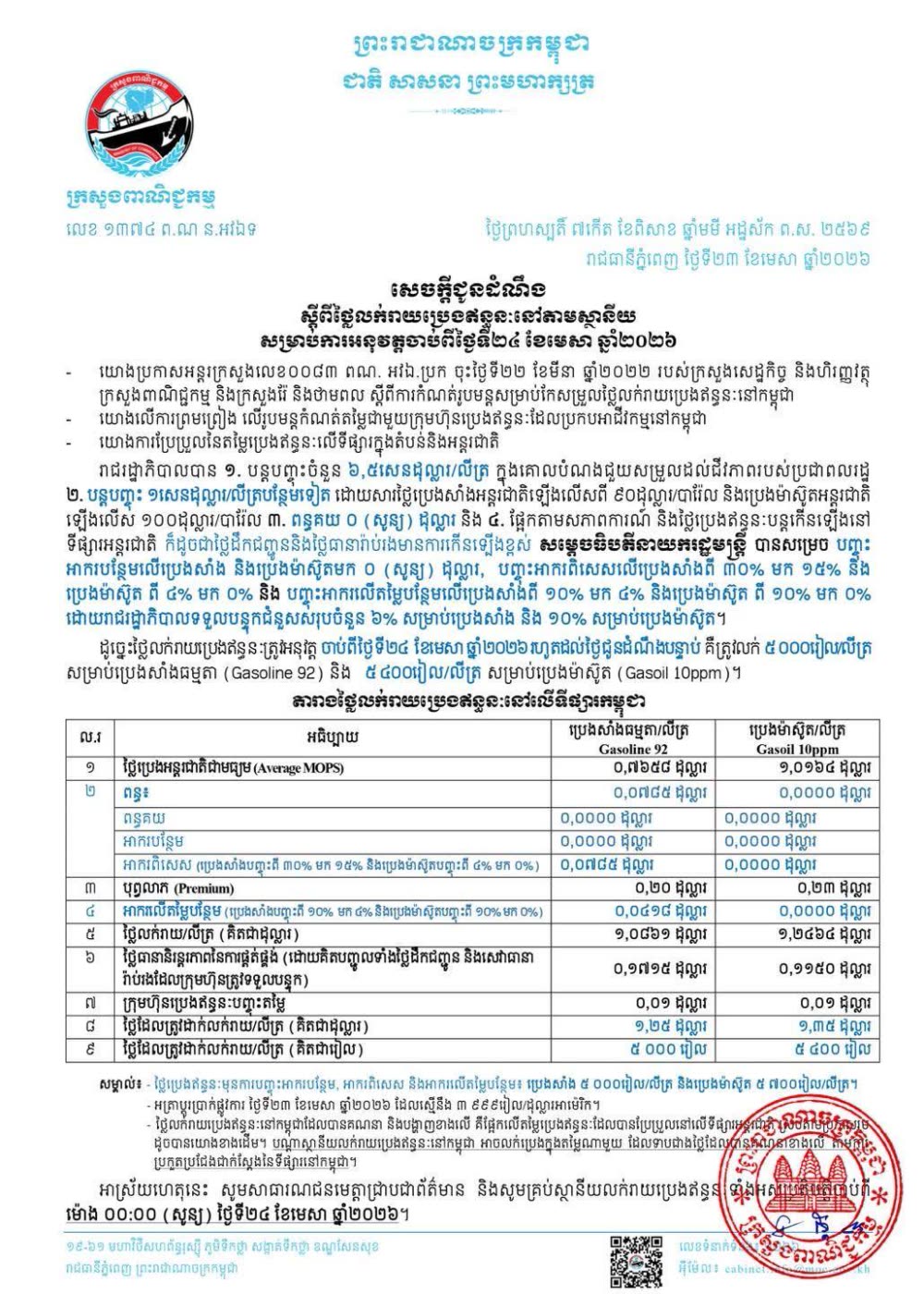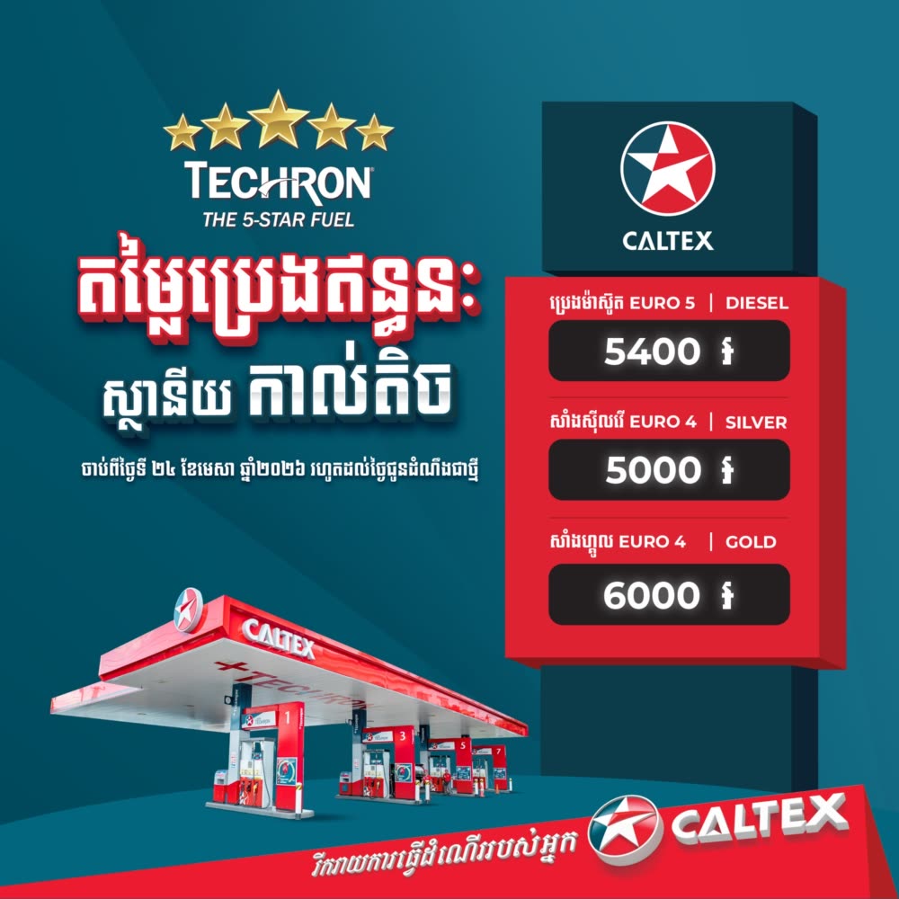 តម្លៃសាំងឡើងថ្លៃ ប៉ុន្តែម៉ាស៊ូតចុះថ្លៃ ចាប់ពីថ្ងៃទី២៤ ខែមេសា ឆ្នាំ២០២៦