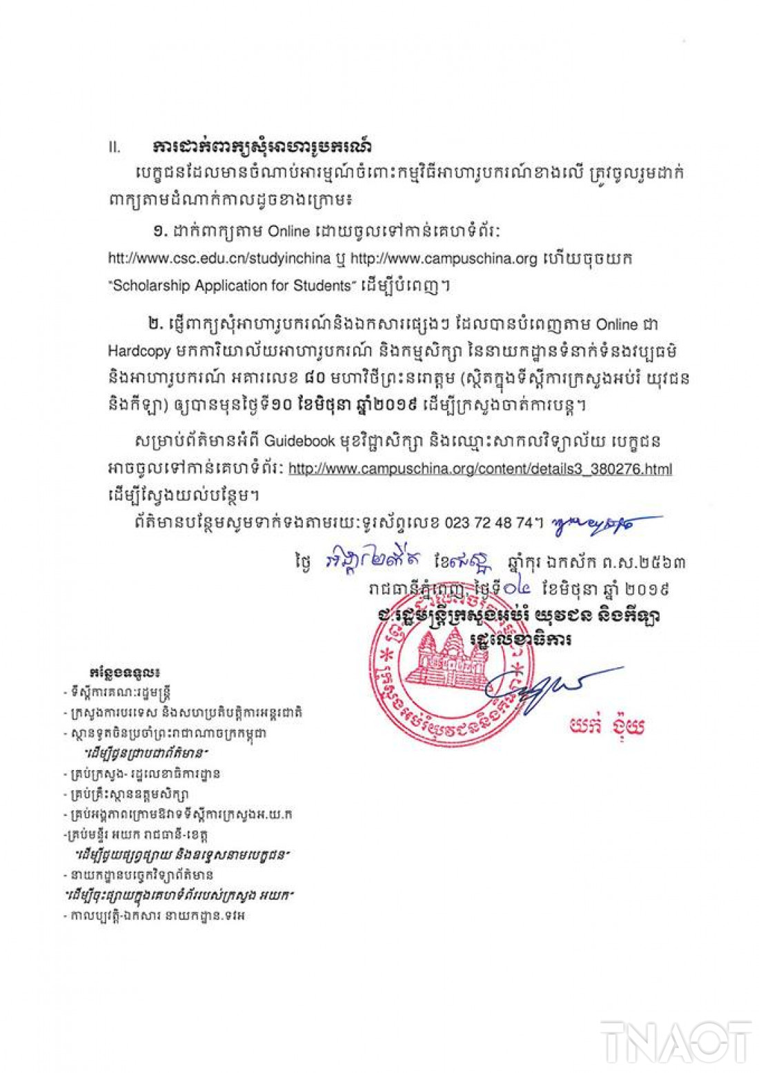២. ផ្ញើពាក្យសុំអាហារូបករណ៍ និងឯកសារផ្សេងៗ ដែលបានបំពេញតាម Online ជា Hardcopy មកការិយាល័យអាហារូបករណ៍ និងកម្មសិក្សា នៃនាយកដ្ឋានទំនាក់ទំនងវប្បធម៌ និងអាហារូបករណ៍ អគារលេខ ៨០ មហាវិថីព្រះនរោត្តម (ស្ថិតក្នុងទីស្ដីការក្រសួងអប់រំ យុវជន និងកីឡា) ឲ្យបានមុនថ្ងៃទី ១០ ខែមិថុនា ឆ្នាំ ២០១៩ ដើម្បីក្រសួងចាត់ការបន្ដ។