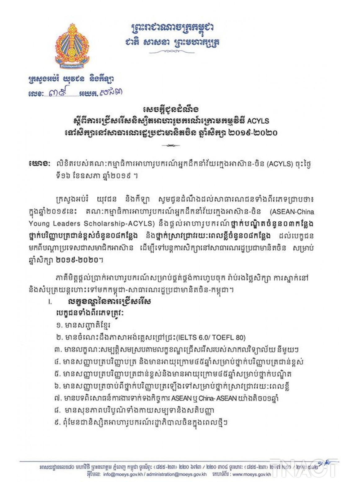ក្រសួងអប់រំយុវជន និងកីឡា បានឲ្យដឹងថា ក្នុងឆ្នាំ ២០១៩នេះ គណៈកម្មាធិការអាហារូបករណ៍ អ្នកដឹកនាំវ័យក្មេងអាស៊ាន-ចិន (ASEAN-Cហិនា Young Leaders Scholarship-ACYLS) នឹងផ្ដល់អាហារូបករណ៍ថ្នាក់បណ្ឌិតចំនួន ០៣កន្លែង ថ្នាក់បរិញ្ញាបត្រជាន់ខ្ពស់ចំនួន ០៨ កន្លែង និងថ្នាក់ស្រាវជ្រាវរយៈពេលខ្លីចំនួន ០៨កន្លែង ដល់បេក្ខជនមកពីបណ្ដាប្រទេសជាសមាជិកអាស៊ាន ដើម្បីទៅបន្ដការសិក្សានៅសាធារណៈរដ្ឋប្រជាមានិតចិន សម្រាប់ឆ្នាំសិក្សា២០១៩-២០២០។ នេះបើយោងតាមសេចក្ដីប្រកាសព័ត៌មានរបស់ក្រសួងអប់រំយុវជន និងកីឡា ដែលបានចុះកាលបរិច្ឆេតថ្ងៃទី ០៤ មិថុនា ឆ្នាំ២០១៩។