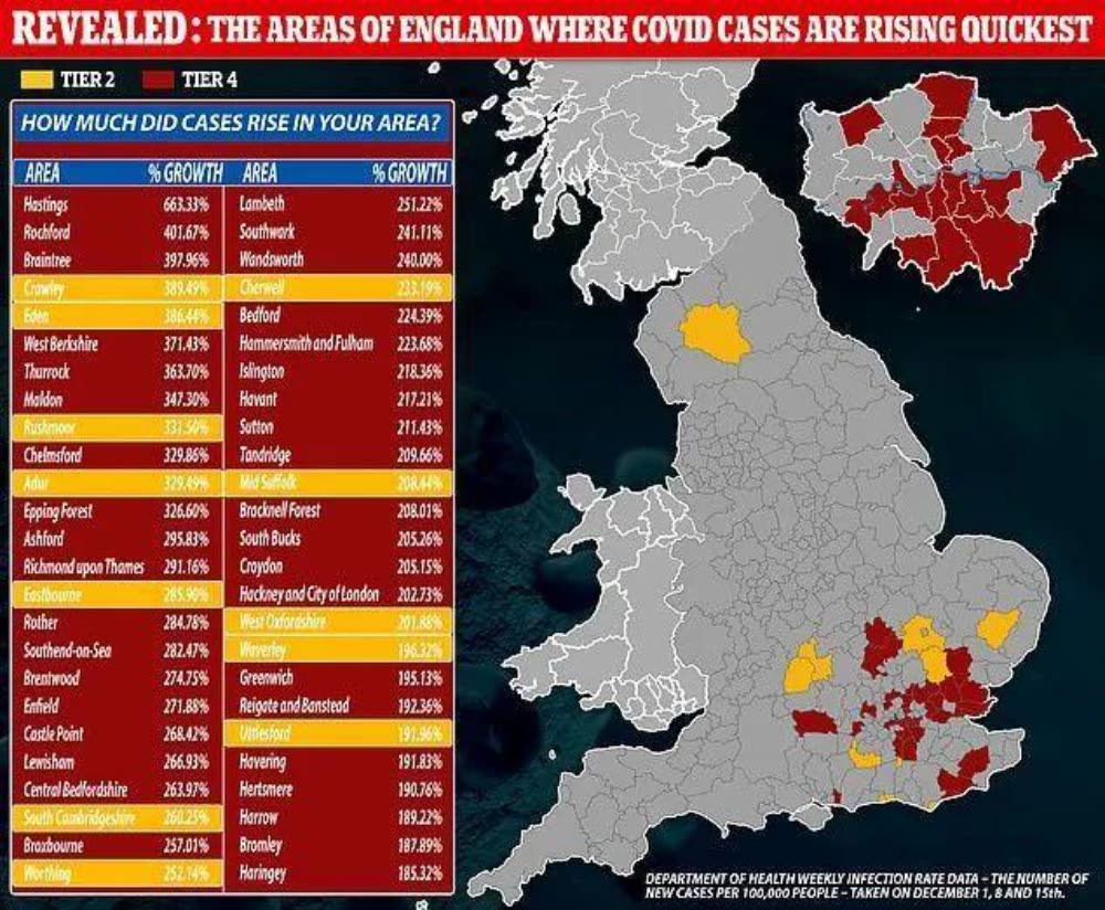 《每日邮报》报道称,英国政府首席科学顾问瓦兰斯已经警告首相约翰逊,到了新年除夕,英格兰地区在医院留医的新冠病人人数将达到今年四月的高峰值,而且在明年一月还会继续增加。