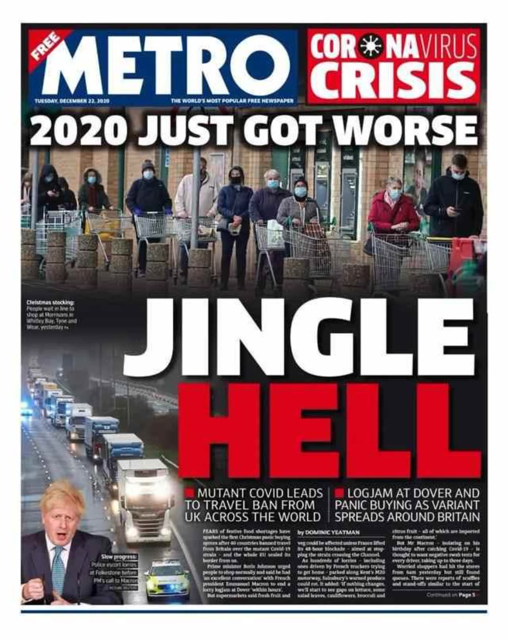 英国《都市报》则称,对英国来说, 2020年的疫情逐渐恶化,并形容英国现在是“圣诞地狱”。 报道说,由于担心法国临时关闭了英法边界48小时,可能导致英国出现圣诞食品短缺的问题,不少英国人昨天到超市和商店抢购圣诞食品。