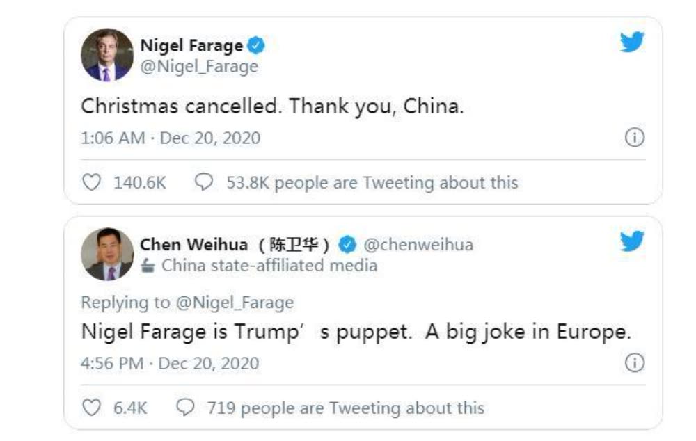 当地时间12月20日,素有英国“大嘴”之称的英国“ 脱欧 党”领袖奈杰尔•法拉奇(Nigel Farage)在推特上发出了一句“无能的挖苦”:“圣诞取消了。谢谢你,中国。”并将该推文置顶。