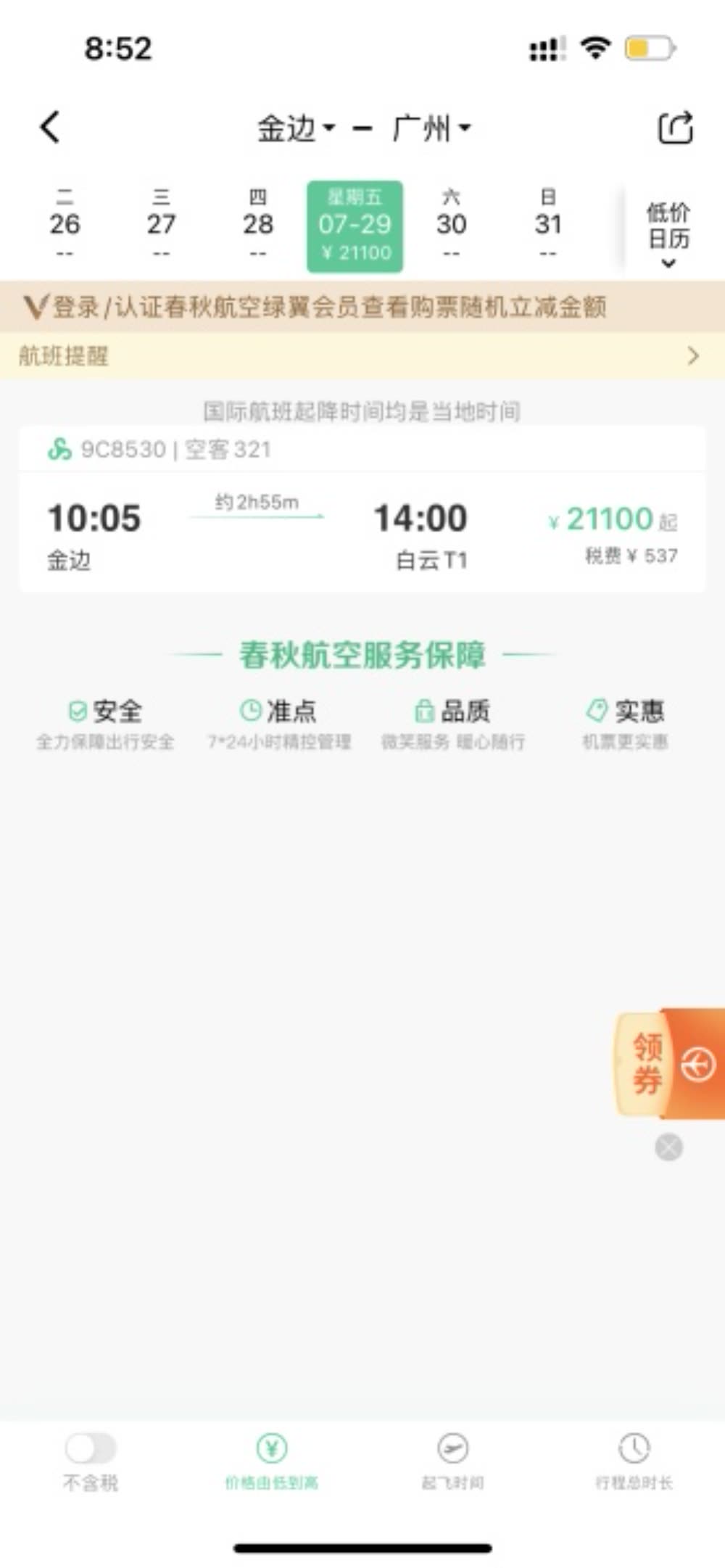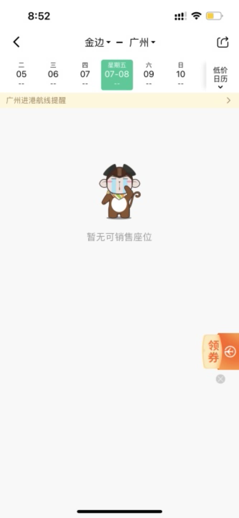 【柬埔寨头条综合报道】据春秋航空app显示,春秋航空目前开放7月——10月金边至广州9C8530航班售票,据消息称售票日期分别为7月8日、7月29日、8月19日、9月09日、9月30日、10月21日,据柬埔寨头条记者登录app查看,目前7月8日已无票在售。