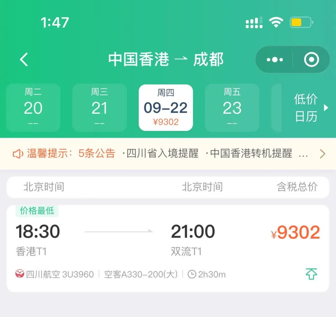 据售票平台显示,9月22日香港到成都票价涨至9000多人民币,而且最近的机票存量极少。10月、11月机票也几乎没票。