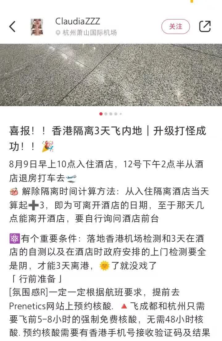 另外一名网友于8月15日分享她在香港隔离3天后,直接搭乘飞机回杭州的经历。