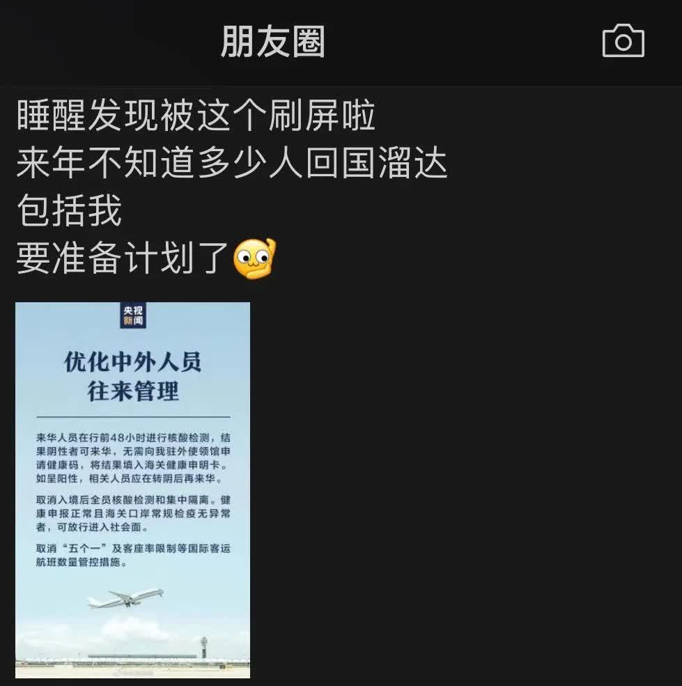 此消息一出,纷纷刷爆海外华人的朋友圈,不少人纷纷表示:“3年了,终于等到了这一天“、还有人表示:”喜大普奔,终于可以回国了“,内心的激动之情溢于言表。对于海外华人来说,盼这一天盼得太久了,今年春节,终于可以回国与家人团聚了。
