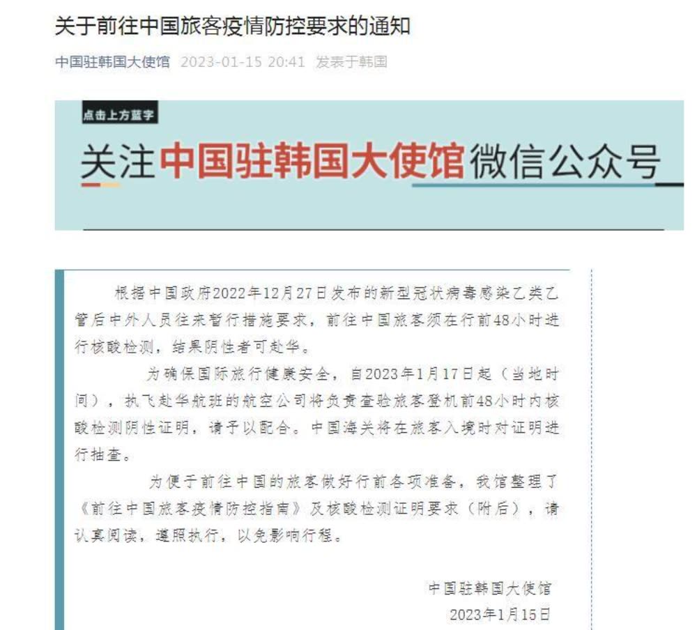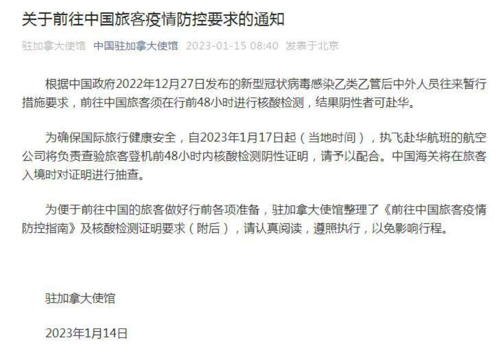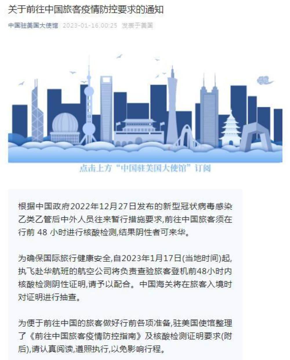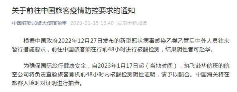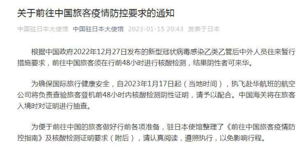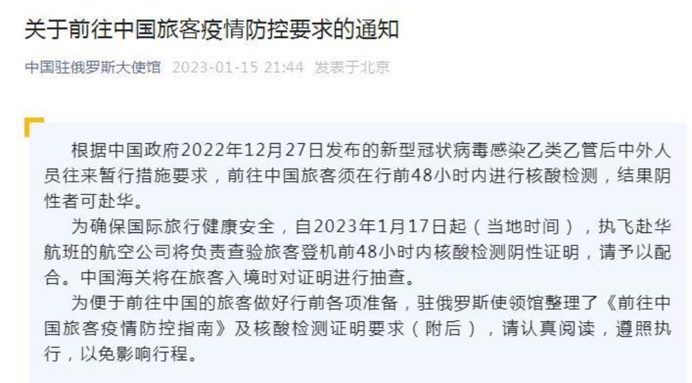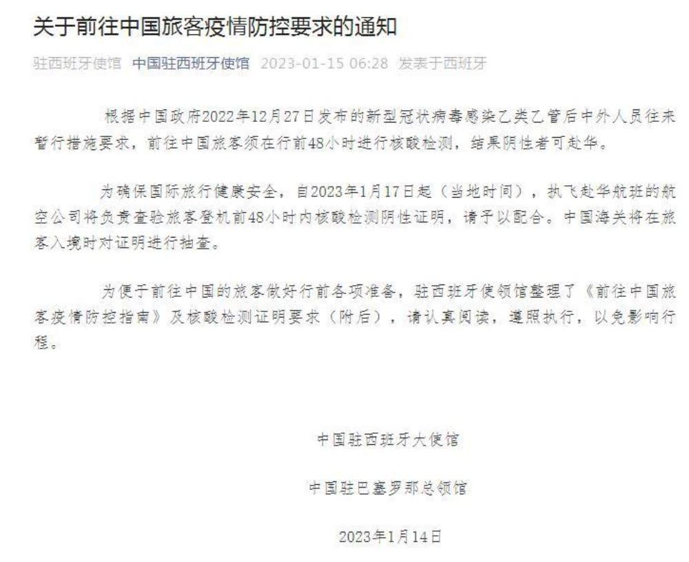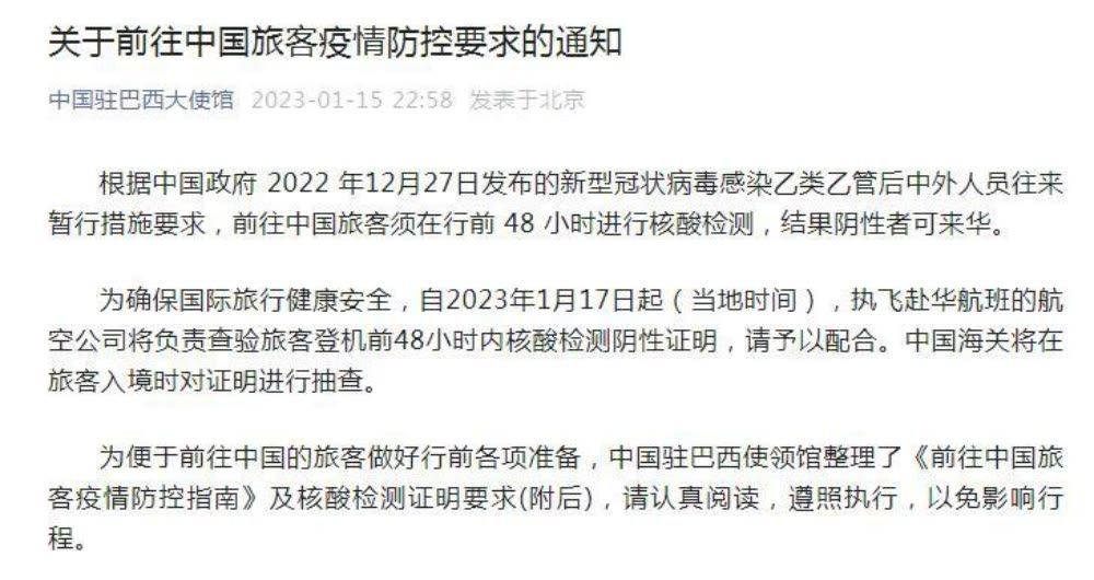 近日,中国驻多国使馆发布“关于前往中国旅客疫情防控要求的通知”:根据中国政府2022年12月27日发布的新型冠状病毒感染乙类乙管后中外人员往来暂行措施要求,前往中国旅客须在行前48小时进行 核酸检测 ,结果阴性者可来华。为确保国际旅行健康安全,自2023年1月17日起(当地时间),执飞赴华航班的航空公司将负责查验旅客登机前48小时内核酸检测阴性证明,请予以配合。中国海关将在旅客入境时对证明进行抽查。