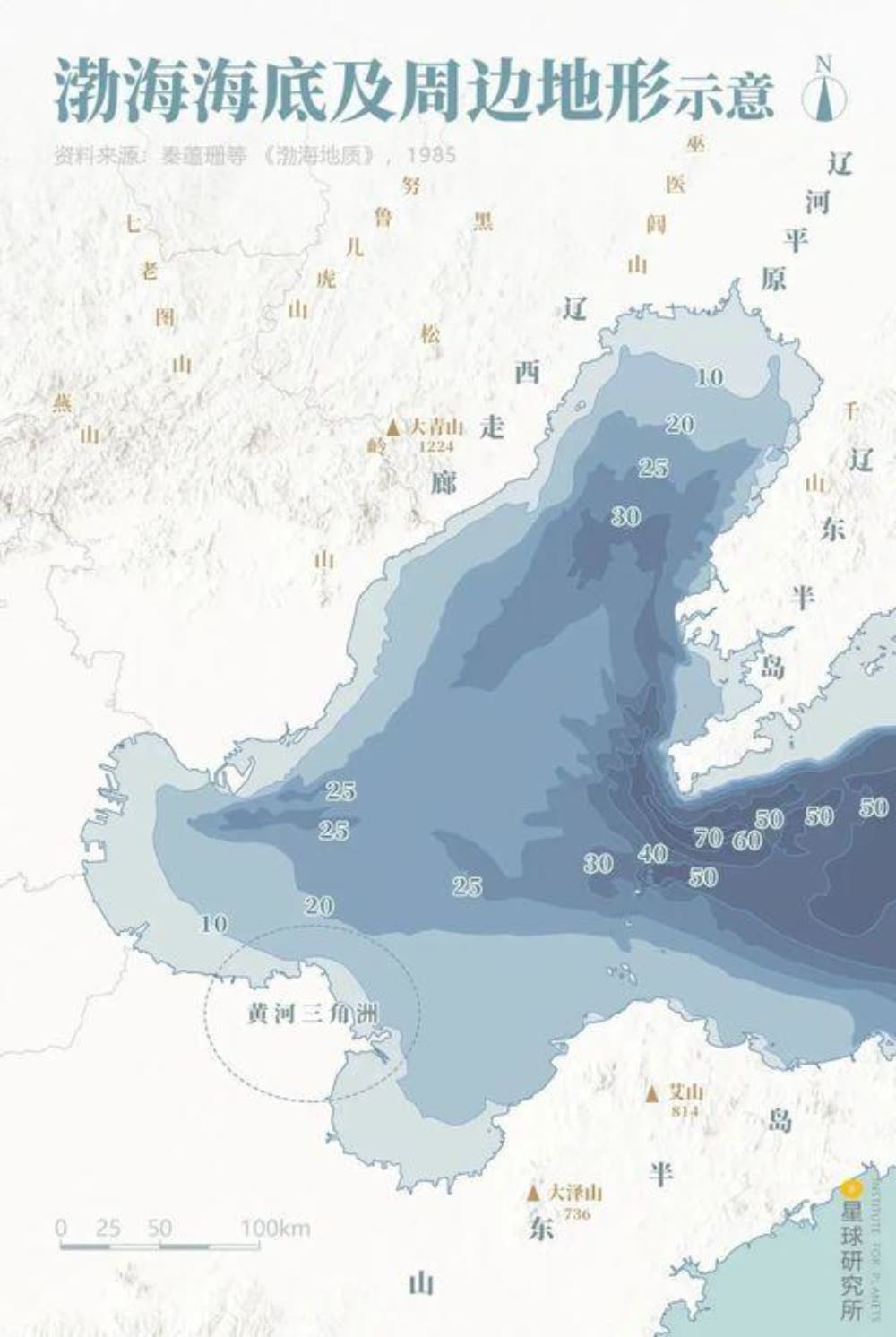 下图是星球研究所做的渤海海底及周边地形示意图: